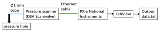 Since the investigated process is steady-state, the length of the pressure tubing does not introduce significant errors. Additionally, data transmission errors via Ethernet from the pressure scanner to the acquisition system are considered negligible, as they are well below the resolution limit of the LabVIEW softwareSP1 used for data acquisition. Therefore, the primary sources of uncertainty in the measurement chain are the accuracy of the pressure scanner (DSA Scanivalve) and the numerical precision of data recording in LabVIEW.