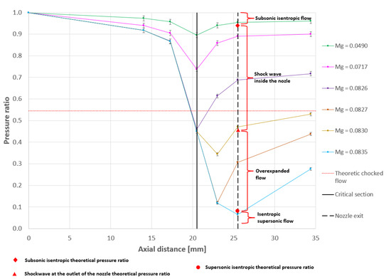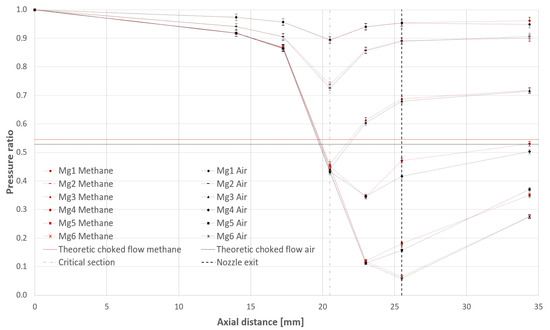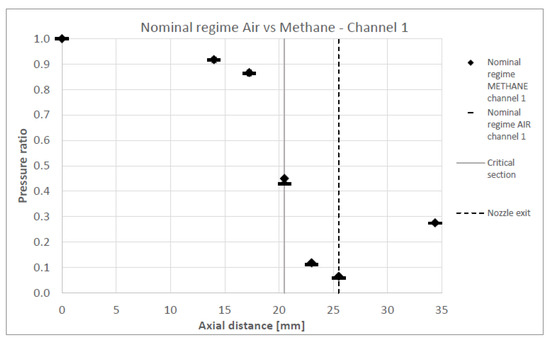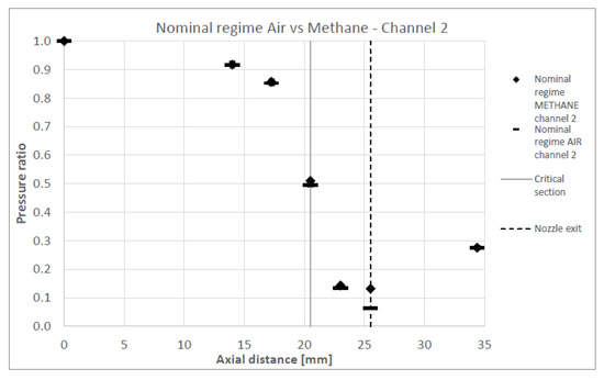 Although these results show a good initial estimation and a difference below 10% for the expected value of the pressure losses when changing the working fluid, some observations must be made. Firstly, these values cannot be used as a comparison metric on their own because the nominal regime was measured for slightly different inlet pressures for methane as compared to air. Secondly, the total pressure at the outlet of the nozzle is measured in a single point, immediately downstream of the shockwave, in a region where there are considerable variations in the flow parameters for very small distances. For a better estimation of the losses, rather than a punctual measurement, more measurement points should be included in the experimental setup in future work. At the same time, increasing the data acquisition frequency for the total pressure measurement is required to capture the shock wave fluctuations.
