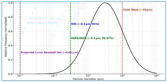 Conceptual illustration of lunar dust particle size distribution overlaid with approximate filtration cutoffs for standard respiratory protection systems. Published analyses indicate that 50% or more of lunar soil particles are <10 µm [5], with many in the submicron range [4]. These are precisely the sizes where N95 and HEPA/PAPR filtration performance declines. The schematic bell-shaped curve may actually underestimate the fine-particle abundance, as the true distribution includes a heavy tail of submicron particles. The purpose of this illustration is to demonstrate the biomedical mismatch between lunar dust size fractions and the limitations of Earth-based protective equipment. Image created by authors.