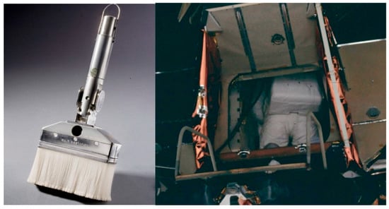 Left: Apollo dust brush used for EVA suit cleaning prior to reentry. Right: Exterior of Apollo Lunar Module showing direct ingress/egress hatch without a true airlock. Image source: NASA, public domain.