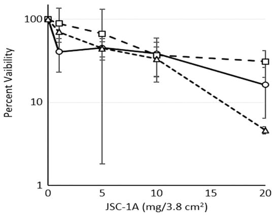 Cell viability following exposure to JSC-1A regolith simulant, sorted by particle size and applied at increasing surface concentrations. Viability decreased in a dose-dependent manner above 10 mg/3.8 cm2. Each curve represents a different particle size range, with smaller particles generally associated with greater cytotoxicity. Data shown are from lab-grown mammalian cell cultures. Image source: NASA Technical Report by Caston [6], public domain.
