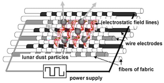 Electrostatic dust mitigation concept using interwoven wire electrodes in fabric. Alternating electric fields repel lunar dust surface particles. Image source: NASA Lunar Dust Challenge [13], public domain.