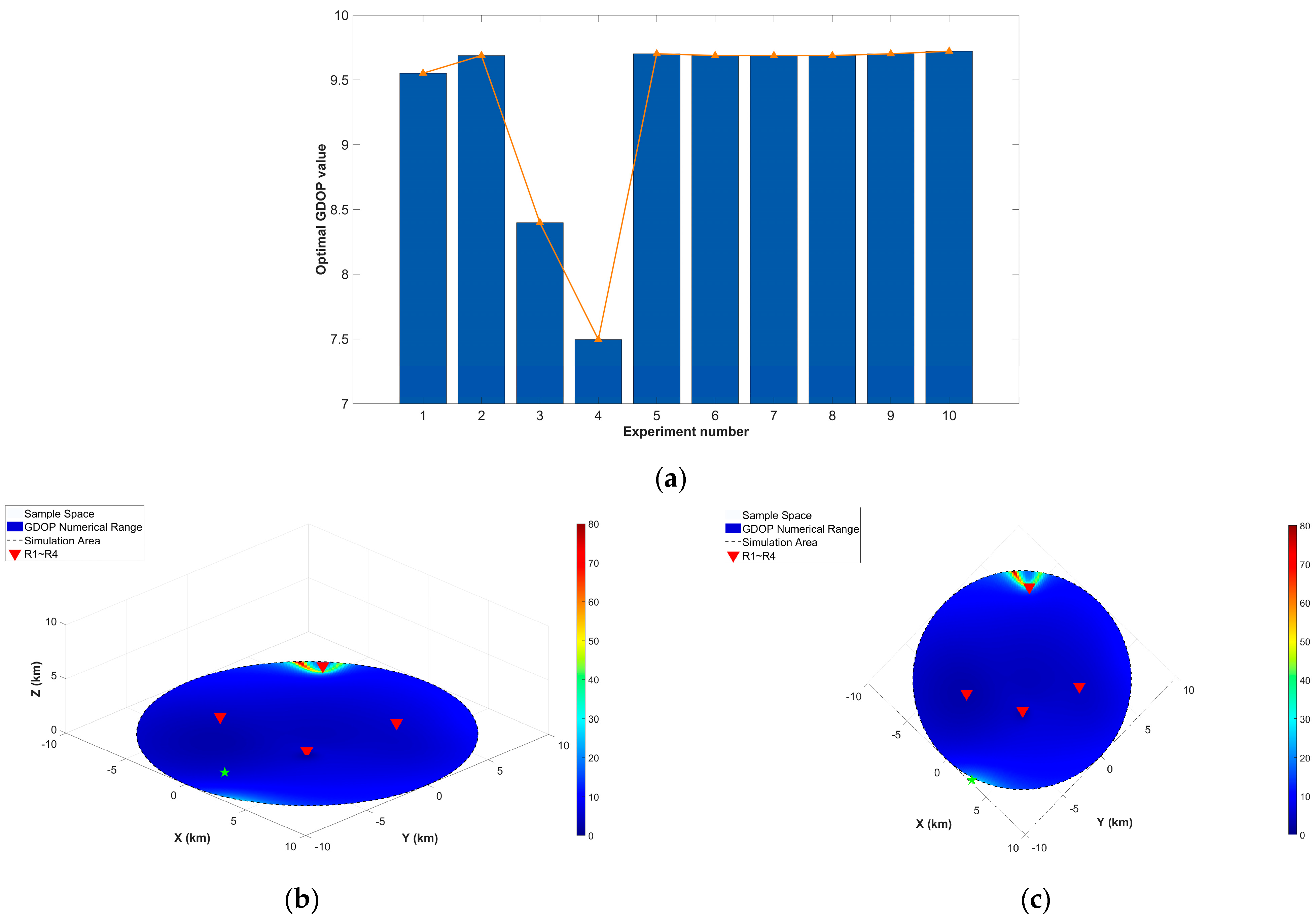 Table 4, the optimal results are obtained in the third iteration of the experiment, in which the optimal position of the sixth pseudolite is R6 = (−1.35, −3.52, 7.98), corresponding to a GDOP value of 2.764852. Through