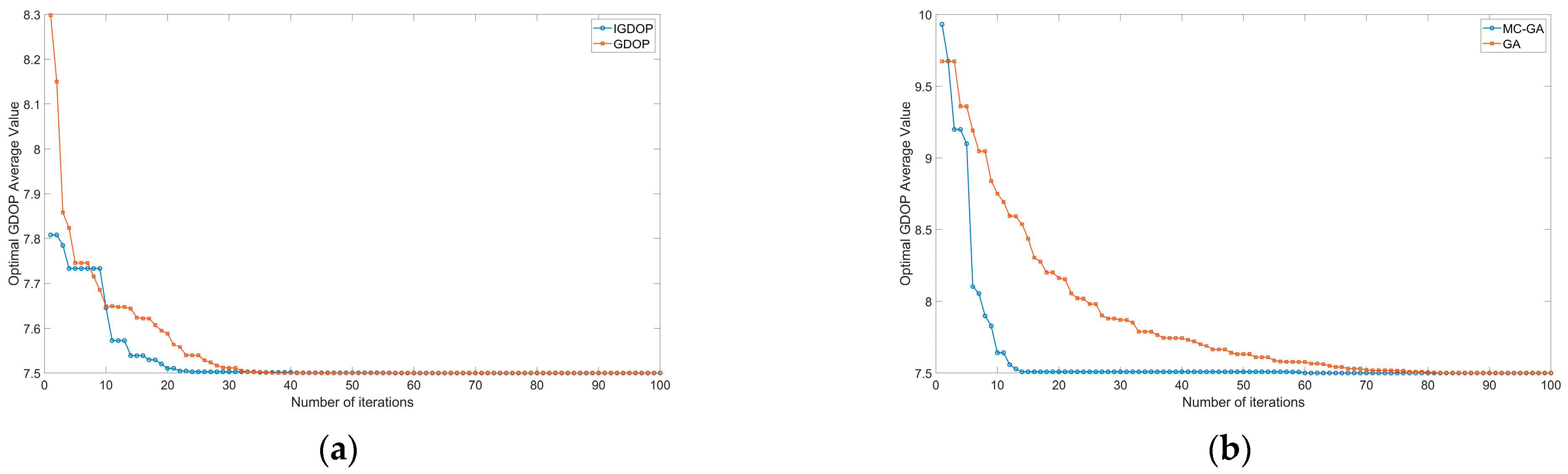 Figure 4a, under the MC-GA algorithm with 100 iterations, the IGDOP model demonstrates faster convergence speed compared to the traditional GDOP model. This improved efficiency stems from the reduced computational load of IGDOP, as indicated by Equations (23)–(25), leading to accelerated convergence.