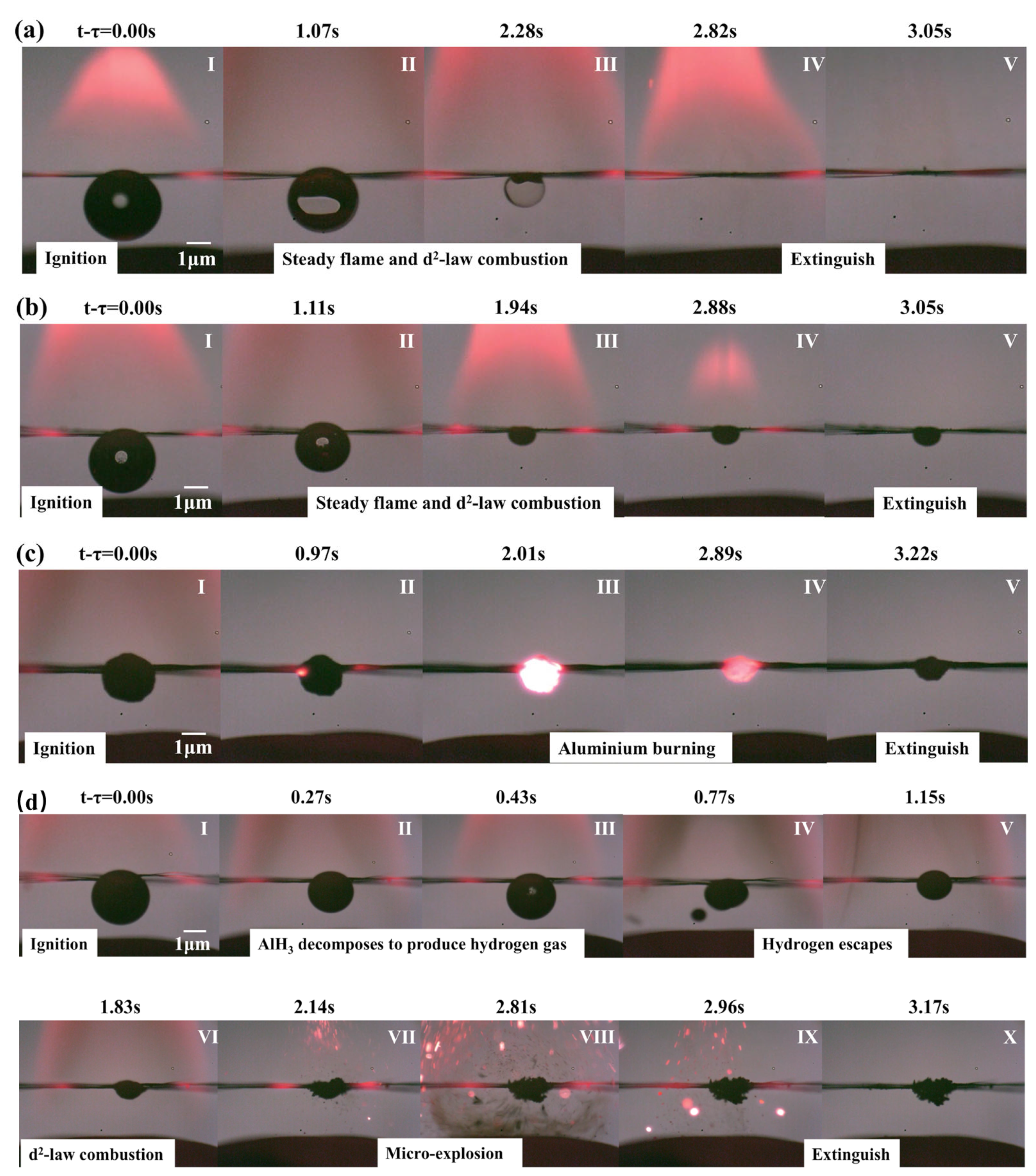 - Gan, Y.; Qiao, L. Combustion characteristics of fuel droplets with addition of nano and micron-sized aluminum particles. Combust. Flame 2011, 158, 354–368. [Google Scholar]