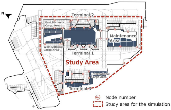 The GSE vehicle corridors in the restricted areas of Haneda Airport were modeled as inputs to AVENUE. The study area covered almost the entire area south of Runway B at Haneda Airport and included the main ODs where GSE traffic is frequent, mainly around all passenger terminal buildings, maintenance area, and cargo areas, as shown in Figure 1. Each OD in this study was defined using the 53 nodes in Figure 1. A list of the 53 nodes is provided in Appendix A Figure A1.