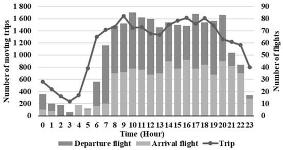 Figure 2 shows the time series of the number of moving trips on 21 November 2019; each time point pertains to the start of a moving trip. The number of moving trips changes with time, suggesting that GSE traffic volume increases or decreases in accordance with the peak hours of aircraft arrivals and departures at Haneda Airport. Therefore, the target hours for the simulation were set from 6:00 to 20:59 on 21 November 2019, for a total of 15 h during the peak hours of aircraft arrivals and departures.