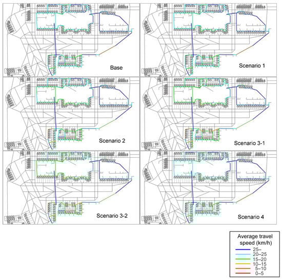 Average travel speed for each scenario from 8:00 to 8:59. Note: The transport graph is modeled for the simulation. Only vehicle corridors covered in the simulation are presented in colors. Some corridors have two colors because their average travel speeds are different between the outbound and return routes.