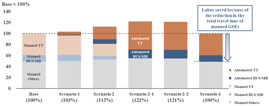 Furthermore, the total travel time of the manned GSEs was confirmed from the breakdown of the automated/manned GSEs in Figure 4. The total travel time of manned GSEs is considered an indicator of the labor-saving effect of GSE operations at the airport. The total travel time of manned GSEs in Scenarios 3 and 4, where the penetration ratio of automation for TT and BUS/MB is 100%, was reduced by half compared with that of the Base case. The results indicate a reduction in work hours and labor savings for GSE drivers. The total travel time of the manned “Others” in Figure 4 increased by ~11% in Scenario 3 compared with that of the Base case because the automated-driving GSEs run at a lower speed. Conversely, in Scenario 4, the total travel time of the manned “Others” remained almost unchanged compared with that of the Base case, and all the travel times for automated-driving GSEs can help save labor.