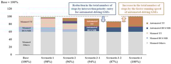 Figure 5 shows the total number of stops for each scenario. The total number of stops is the sum of the stops for all GSEs in the entire study area during all periods covered by the simulation. The number of stops represents the number of times each GSE applied brakes to stop when entering an intersection or approaching another GSE traveling ahead and the number of times each GSE slowed down to match the speed of another GSE traveling ahead in a congested area, remaining below 1 km/h for 3 s or more. The total number of stops is considered a surrogate indicator of the safety of the GSE operation at the airport because it can be regarded as an opportunity to brake to stop or slow down to avoid a collision with the leader GSE. The total number of stops in Scenarios 1, 2, and 3-1 were reduced by 2, 4, and 6%, respectively, compared with that of the Base case. As shown above, the total number of stops decreased in Scenarios 1, 2, and 3-1 with an increase in the automation of the TT and BUS/MB. In Scenario 3-2 with intersection priority entry for automated-driving GSEs, the total number of stops was reduced by 7% compared with that of Scenario 3-1 and by 13% compared with that of the Base case. An operational rule that provides intersection priority entry to automated-driving GSEs can have a certain effect on reducing the total number of stops.