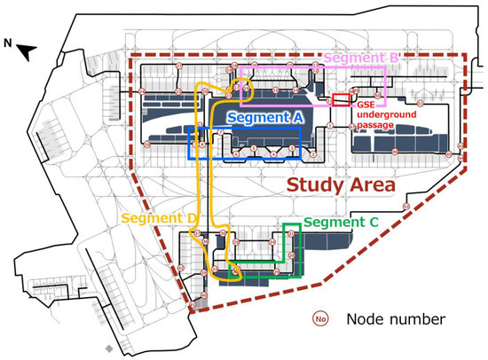The simulated values of average travel times were compared with the measured values for some specific segments, referred to as “target segments”, to verify the reproducibility of the simulations. The measured values were obtained from moving trips based on observational data from the airport. Each average travel time is the average time of all the GSEs traveling along each target segment. We selected four target segments, A, B, C, and D, as indicated in Figure 6: different segments as a representative with high GSE traffic volumes with lengths of ~1–3 km from Terminals 1, 2, and 3, and the area connecting the terminals in the airport restricted area. Some segments had differences in travel time and length between the outbound and return routes caused by one-way routes or right/left-turn directions at the intersections. Therefore, the reproducibility of each of the four target segments was confirmed for both outbound and return routes. For example, there is a one-way corridor along the Terminal 1 building; therefore, GSEs traveling from south to north along this building must detour around nodes 2, 4, and 6, as depicted in Figure 6.