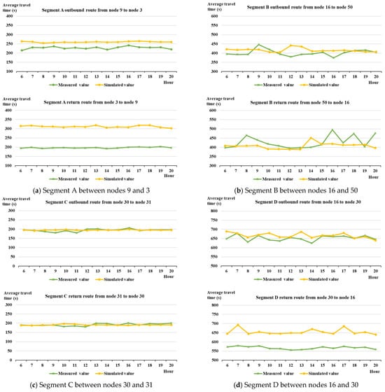 Figure 7 shows the reproducibility of the target segments: (a) Segment A, (b) Segment B, (c) Segment C, and (d) Segment D. Segment A between nodes 9 and 3, illustrated in Figure 6, is a target segment from the Terminal 1 area; the outbound route of Segment A is 1272 m in length from node 9 to nodes 8, 7, 5, and 3. The return route is 1351 m in length from node 3 to nodes 4, 5, 6, 7, 8, and 9. The return route runs from south to north and is longer than the outbound route because the GSEs must detour around points 4 and 6. The simulated values reproduced the trend of the time variability of the measured values for both the outbound and return routes; however, there was a certain gap between the simulated and measured values. The gap varied based on the time of day, from 8.8 to 22.8% (~21–49 s) for the outbound route and from 51.3 to 61.9% (~104–121 s) for the return route. Segment B between nodes 16 and 50 is a target segment from the Terminal 2 area. The outbound route of Segment B is 2129 m in length from node 16 to nodes 15, 14, 12, 11, 49, and 50. The return route is 2129 m in length from node 50 to nodes 49, 11, 12, 14, 15, and 16. The simulated values were consistent with the measured values across many time intervals for both the outbound and return routes. However, a certain gap exists between the simulated and measured values in certain time intervals, and the simulated values were sometimes lower than the measured values. The gap between the simulated and measured values varied based on the time of day, from 0.6 to 16.1% (~2–61 s) for the outbound route, and from 0.6 to 16.8% (~2–80 s) for the return route. Segment C between nodes 30 and 31 is a target segment from the Terminal 3 area. The outbound route of Segment C is 997 m in length, from node 30 to nodes 29, 28, and 31. The return route is 997 m in length, from node 31 to nodes 28, 29, and 30. The simulated values were almost consistent with the measured values during all target hours for both the outbound and return routes. The gap between the simulated and measured values ranged from 0.1 to 8.7% (~0–16 s) for the outbound route and from 0.1 to 8.4% (~0–15 s) for the return route. Segment D between nodes 16 and 30 is a target segment from the area connecting the terminals. The outbound route of Segment D is 3725 m in length, from node 16 to nodes 17, 21, 20, 8, 53, 38, 37, 36, 33, and 30. The return route is also 3725 m in length, from node 30 to nodes 33, 36, 37, 38, 53, 8, 20, 21, 17, and 16. Note that there is a long but narrow tunnel between nodes 38 and 53. The simulated values were consistent with the measured values across many time intervals for the outbound route and reproduced the trend of time variability of the measured values for the return route. However, a certain gap exists between the simulated and measured values. The gap varies based on the time of day, from 0.1 to 6.2% (~0–40 s) for the outbound route and from 12.3 to 19.5% (~71–113 s) for the return route.