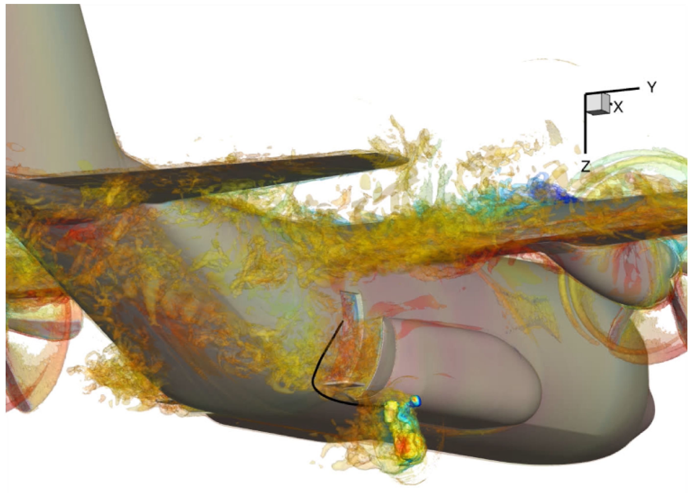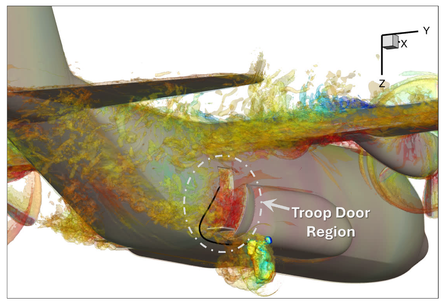 Figure 1 highlights the proximity turbulence near the troop door region and the propeller-induced flow structures from a C-130J. This simulation architecture represents the baseline case study that is investigated.