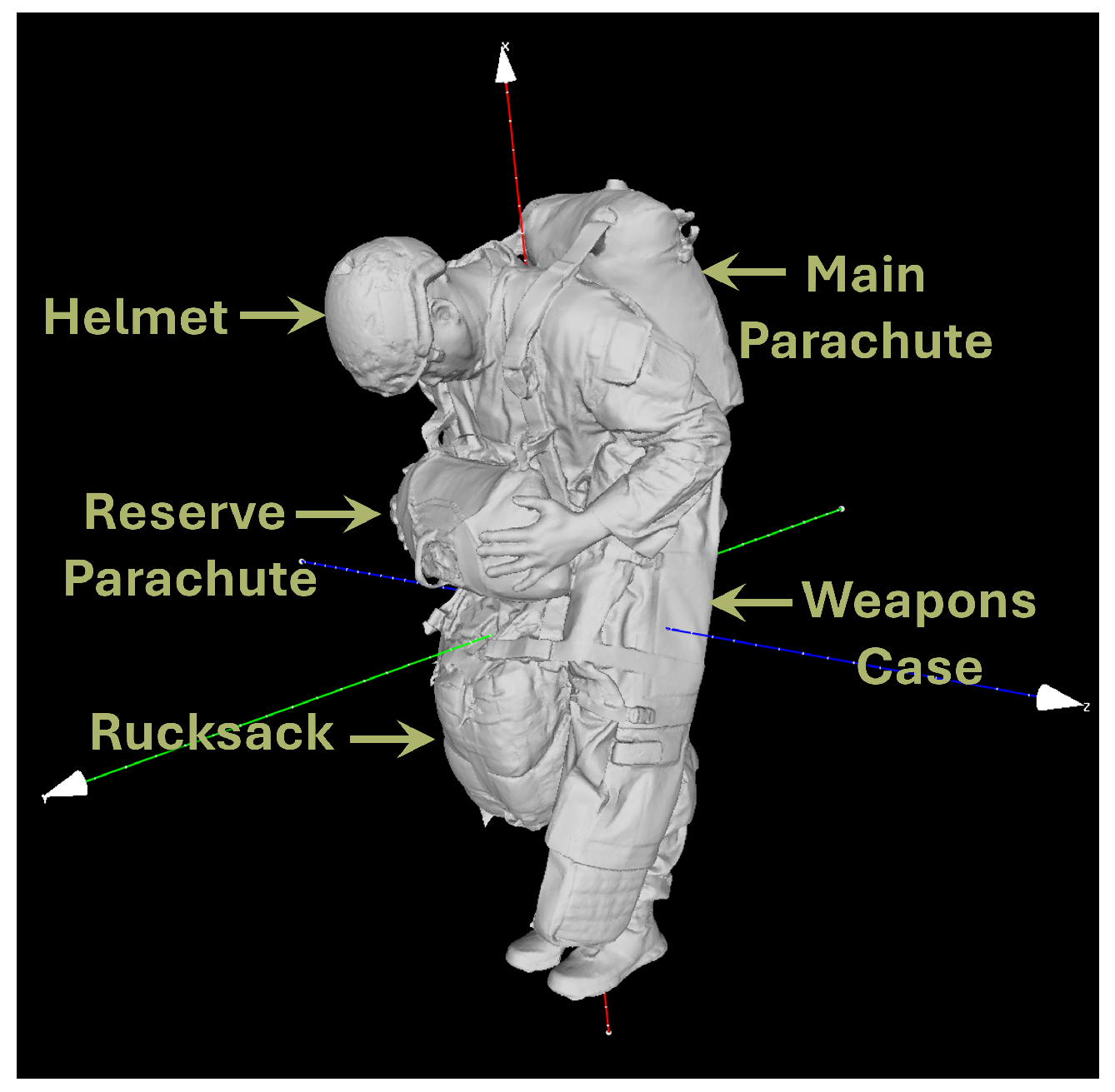 Figure 2 shows a baseline paratrooper scan in full combat equipment with the weapons case on the left side in a nominal tight body position. Alternatively, off-nominal paratrooper scans were taken to consider the aerodynamic consequences for an improper exit. The combination of these variables introduces asymmetric shapes and off-center mass distributions. These first-order factors can lead to unpredictable rotation, tumbling or lateral drift immediately after exit.