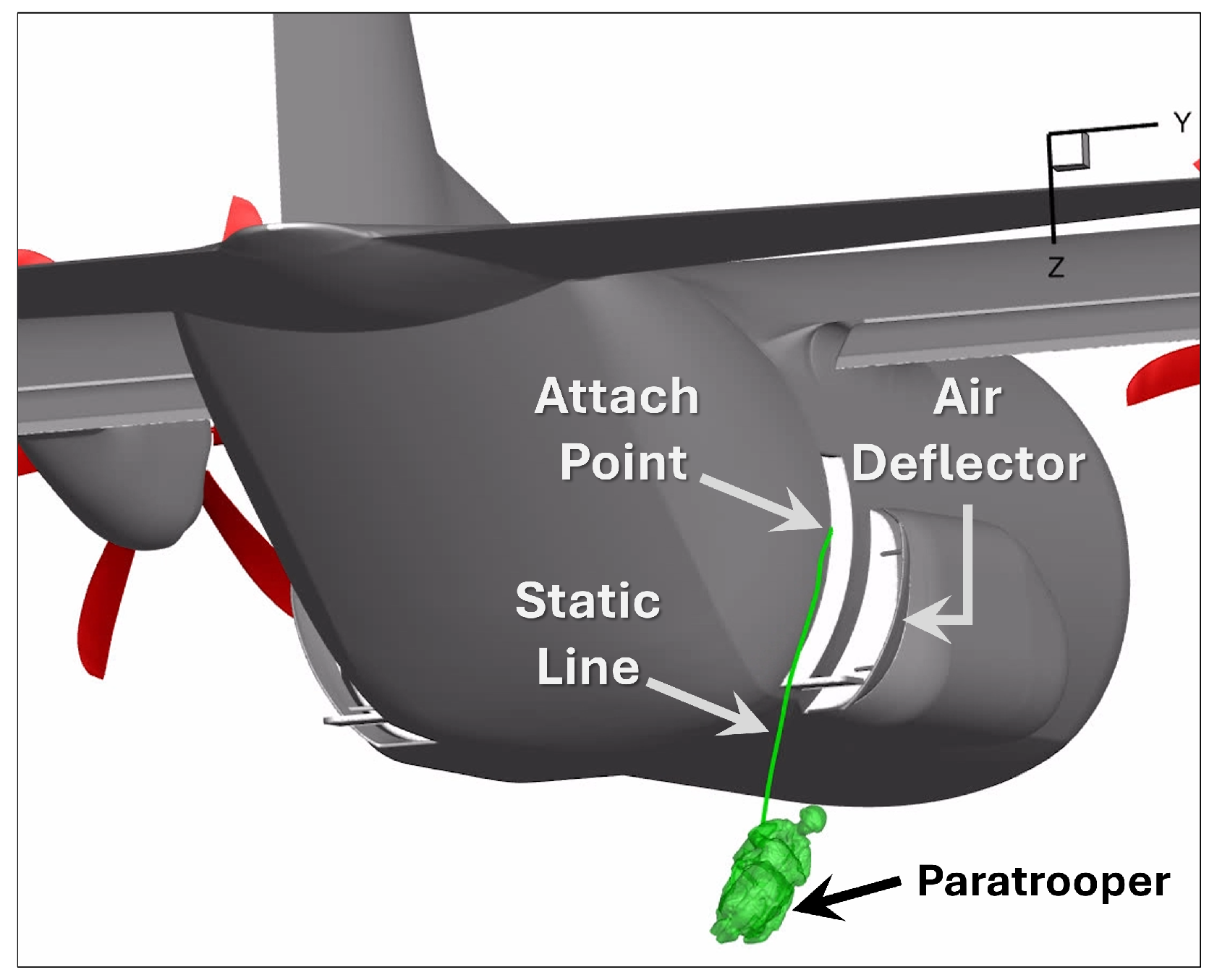 9]. For personnel airdrops, human body models derived from 3D scans allow detailed six-degree-of-freedom simulations of jumper trajectories and interactions with aircraft wakes [