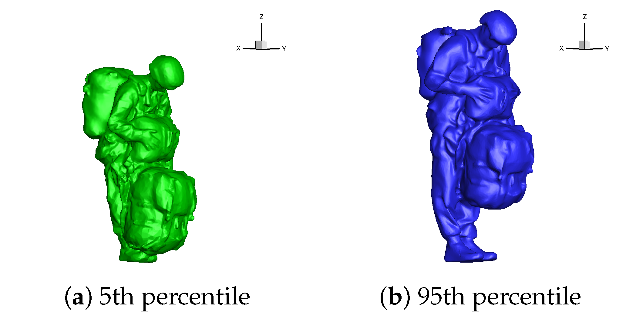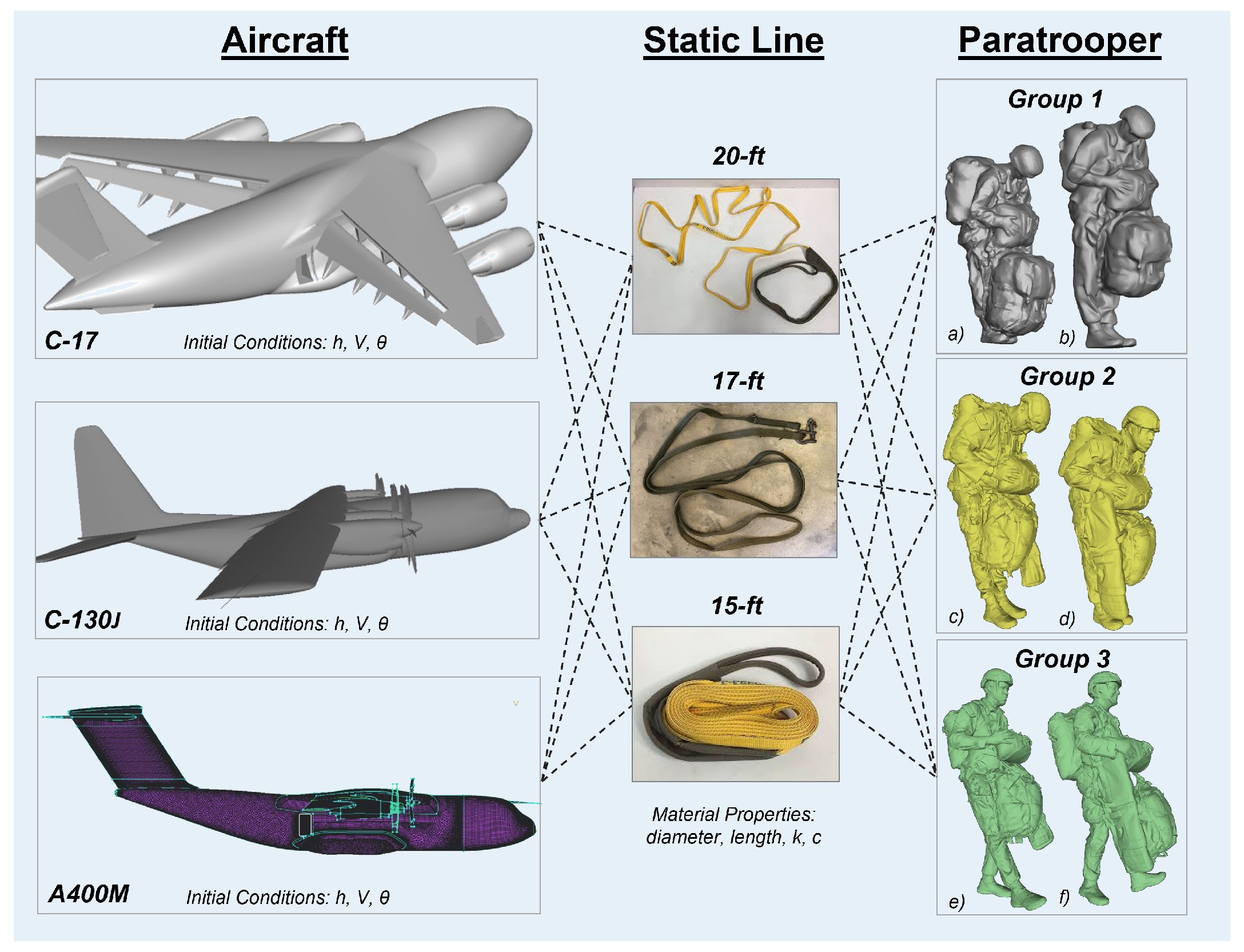 An additional layer of complexity is introduced to account for two areas of variability, which are physical characteristics and paratrooper equipment. Each paratrooper varies in height, weight and body shape ranging from the 5th percentile female to the 95th percentile male. During a static line airborne operation, a paratrooper requires standard equipment, which includes a main parachute, reserve parachute, weapons case, and rucksack.
