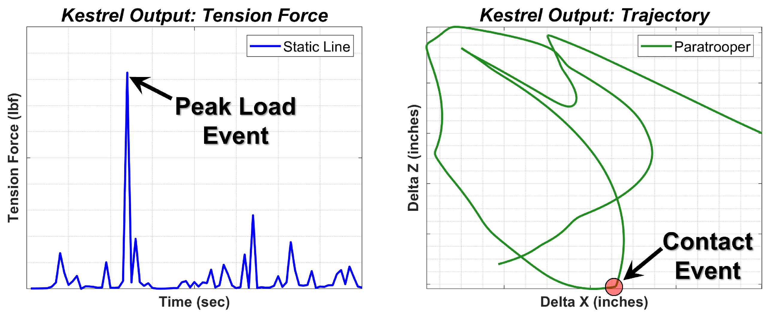 Figure 4 is the output required to effectively compare each study to make informed performance decisions. Kestrel is configured to export relevant output at each timestep to support paratrooper stability studies. The output is categorized by paratrooper kinematics, cable tension force and aerodynamic forces and moments. For this case study, paratrooper kinematics output includes translational displacement, velocity, rotational rates and acceleration to track stability throughout the simulation run. A contact model is active between the paratrooper and fuselage to monitor contact points and identify unfavorable static line lengths or aircraft settings. The static line tension force is monitored to verify that the line has not exceeded any physical limits that would indicate a failure. Output includes tension, stress and strain. Aerodynamic forces and moments on the paratrooper and aircraft are monitored to understand the magnitude of their effects and interactions under specified aircraft conditions. The purpose of defining the baseline output is to ensure the correct variables are saved to support projects evaluating design decisions to mitigate risk factors affecting a paratrooper during standard exits. A sample of the output generated is shown in