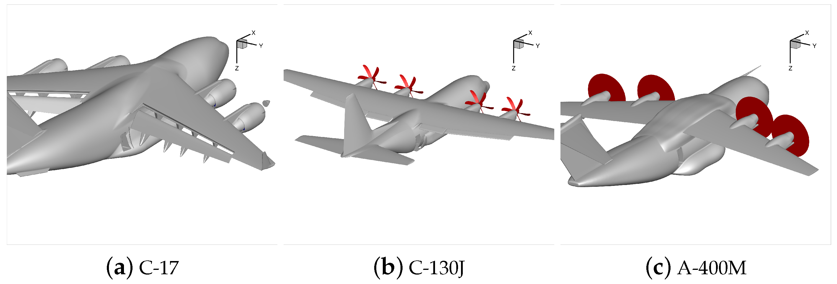 Each aircraft model was stationary during the simulations, with propulsion modeling specific to the platform: the C-17 used prescribed inlet and exhaust boundary conditions, including hot/cold mass flow rates and temperatures; the C-130J featured rotating propeller blades and spinner via prescribed motion; and the A400M employed actuator disks driven by user-defined thrust values, distributions, and angular velocities.