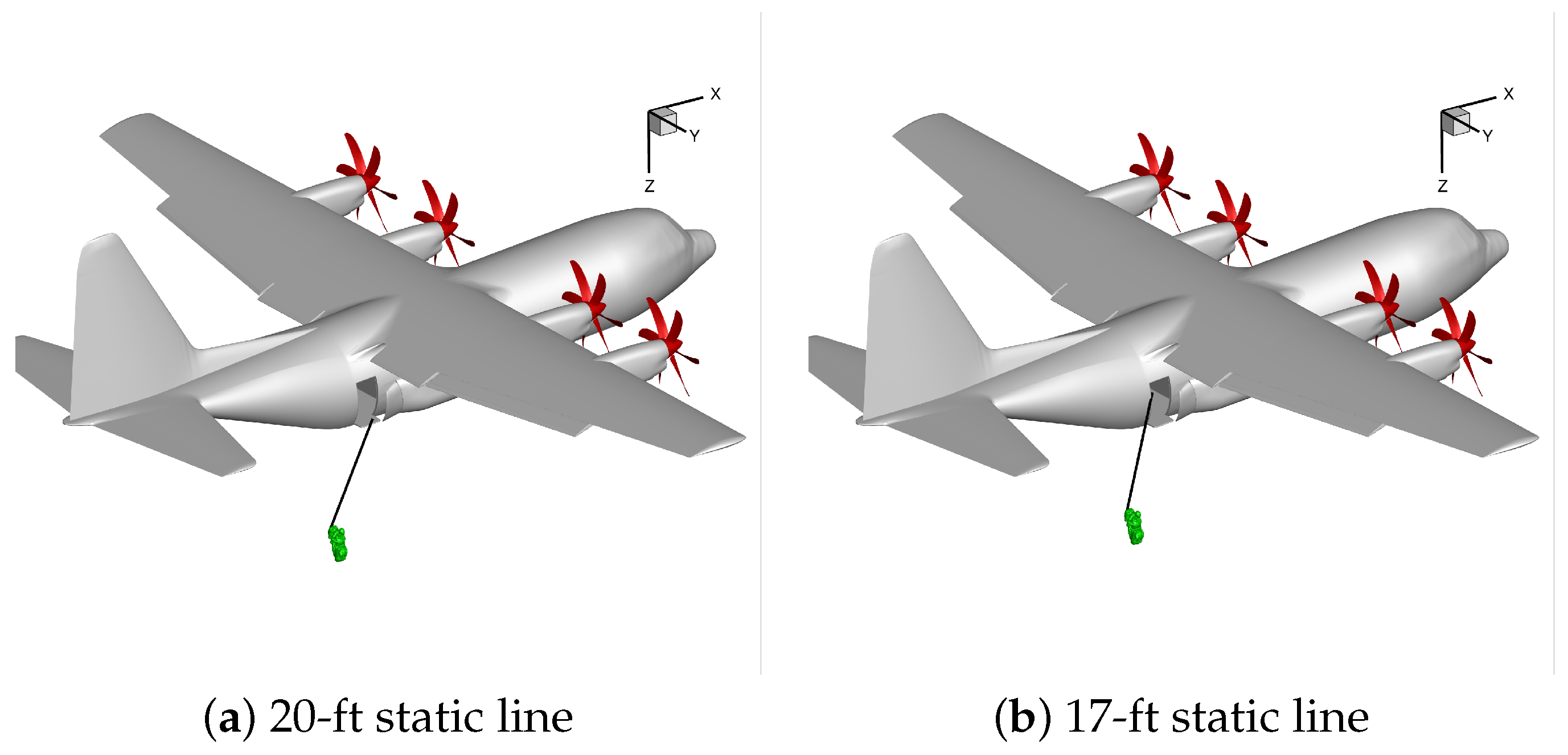 The next set of simulations focuses on the towed-jumper scenario from the C-130J aircraft, featuring spinning propellers and a 17-ft static line. The simulation setup is illustrated in