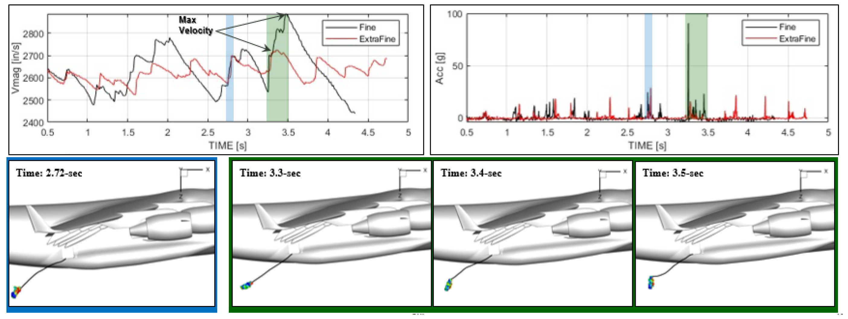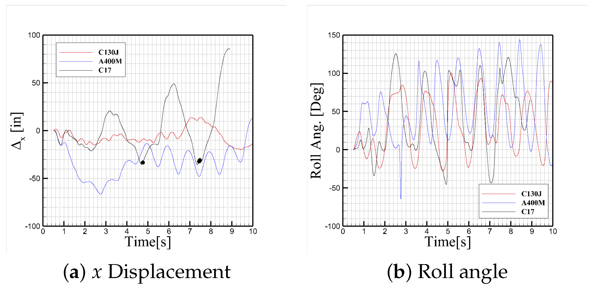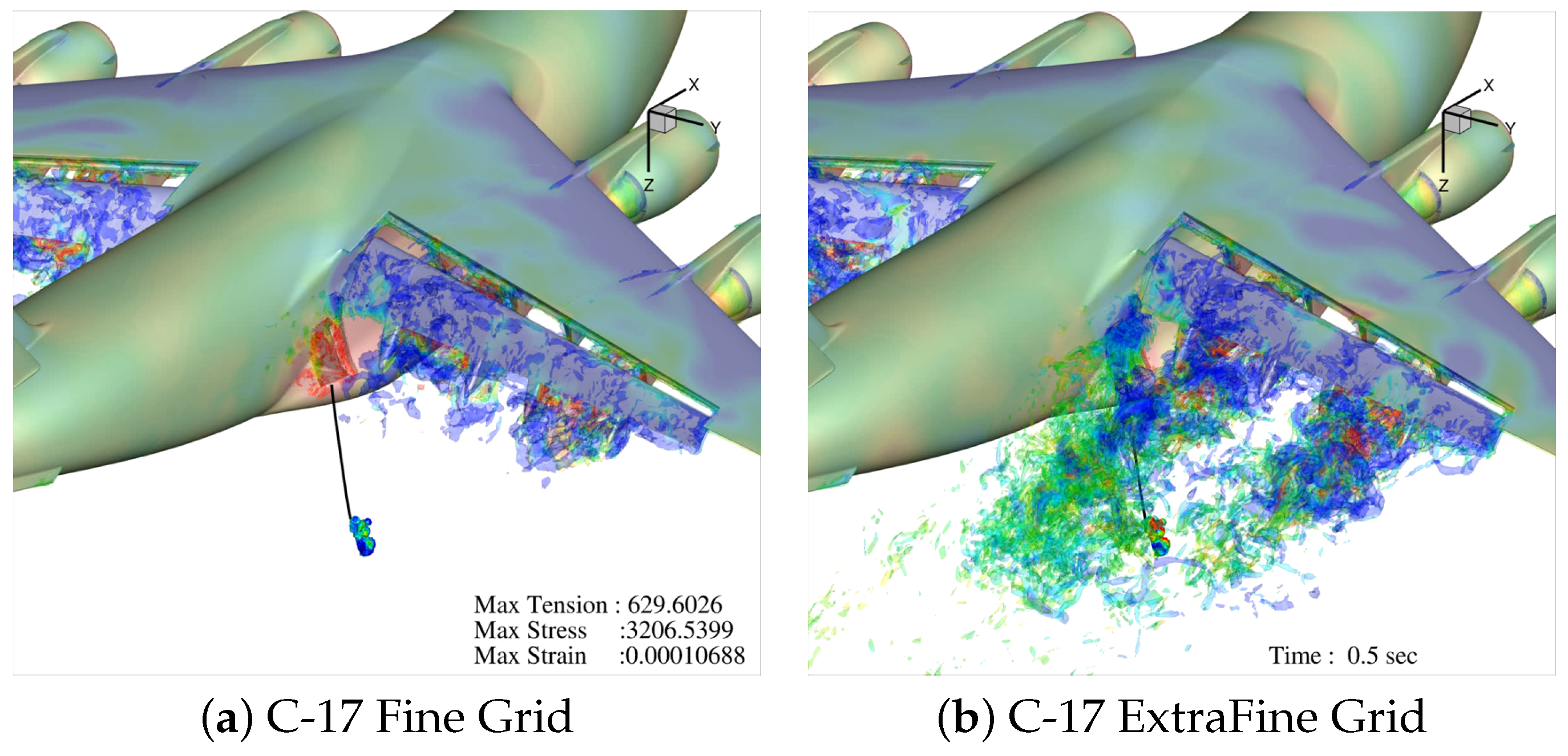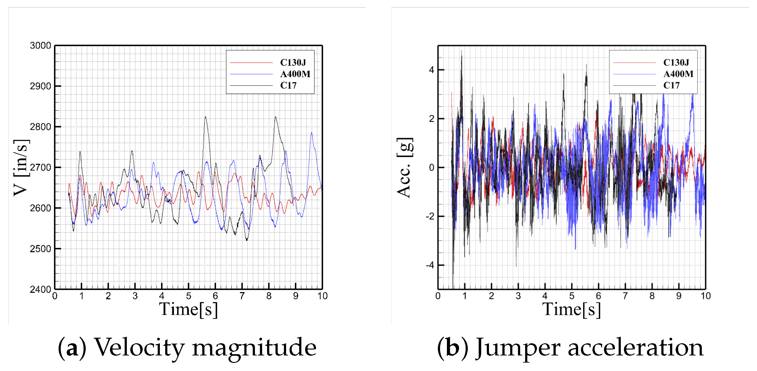 Based on these findings, the ExtraFine Grid was selected for all subsequent simulations, including those for the C-130J and A400M. Several issues identified in the initial runs were corrected: (1) the cable attachment point was incorrectly set at the ramp instead of the troop door, (2) the Young’s modulus used for the cable was unrealistically high (200 GPa), resulting in large transient accelerations, and (3) the jumper’s initial position relative to the aircraft introduced large initial disturbances. These issues are addressed in the following sections.