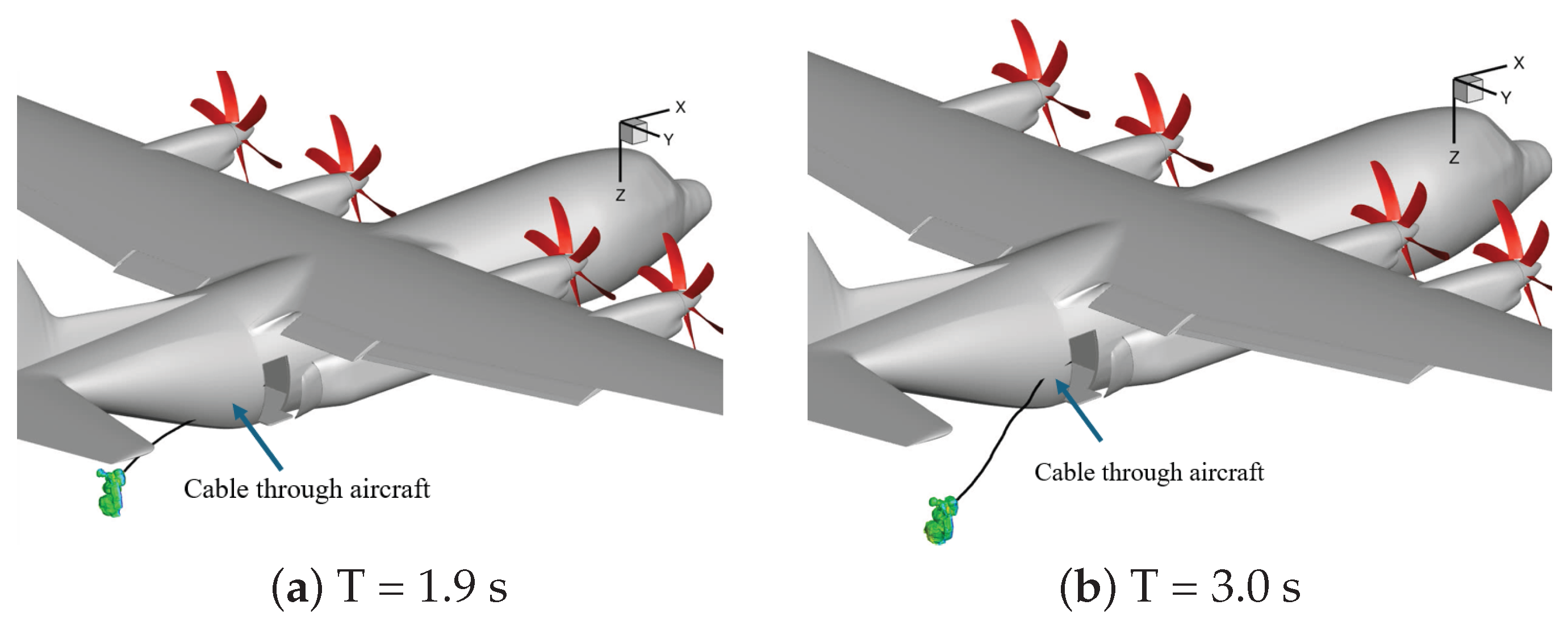 Please note that the present modeling framework incorporates cable elasticity, damping, and cable–airframe contact, but it does not explicitly resolve wake–cable interactions. This simplification may underpredict certain oscillatory behaviors or dynamic loading effects. In the revised manuscript, we have more explicitly acknowledged this limitation and outlined future directions for model development. Planned improvements include the introduction of torque damping to mitigate unrealistic angular excursions, incorporation of flow-induced vibration modeling, and enhanced cable–flow coupling strategies. These advancements are identified as priorities for upcoming work to improve the physical fidelity of the simulations and provide more accurate predictions of towed jumper dynamics.
