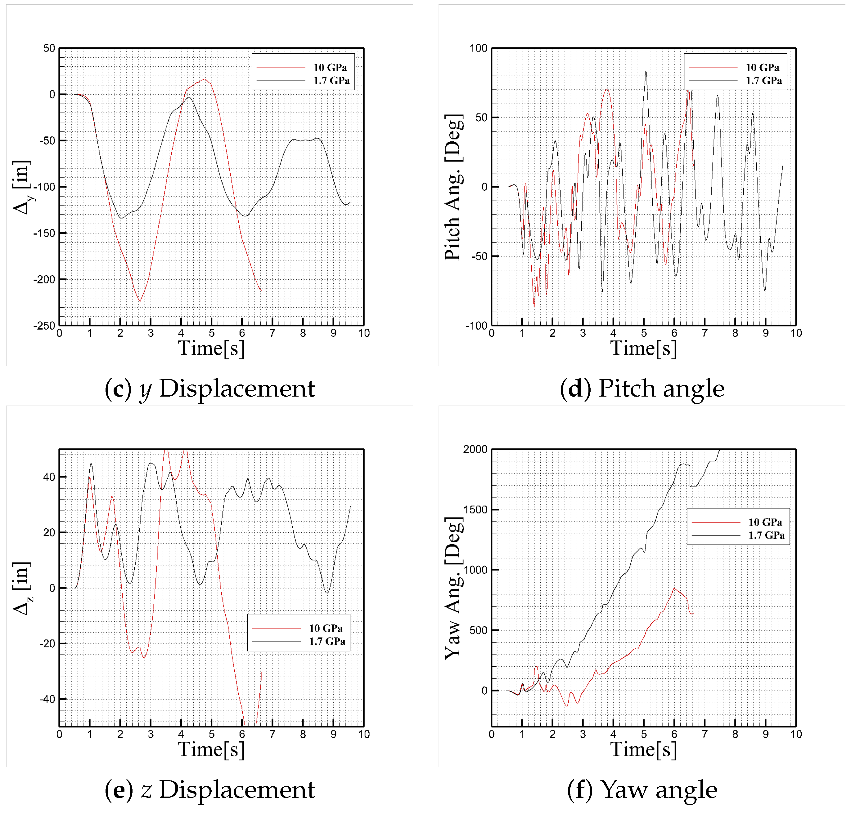 Figure 26 presents the translational and rotational motion histories of a 5th percentile jumper towed by three different aircraft configurations—C-17, C-130J, and A400M—each using a 17-ft static line with a Young’s modulus of 1.7 GPa. Among the three platforms, only the C-17 case exhibited jumper contact with the aircraft, as indicated by circular markers in the translational displacement plots (subfigures (a), (c), and (e)). Four distinct contact instances were recorded for the C-17 configuration, with the final three occurring in rapid succession, suggesting repeated impacts during a short time window when the jumper remained in close proximity to the aircraft fuselage. In addition,