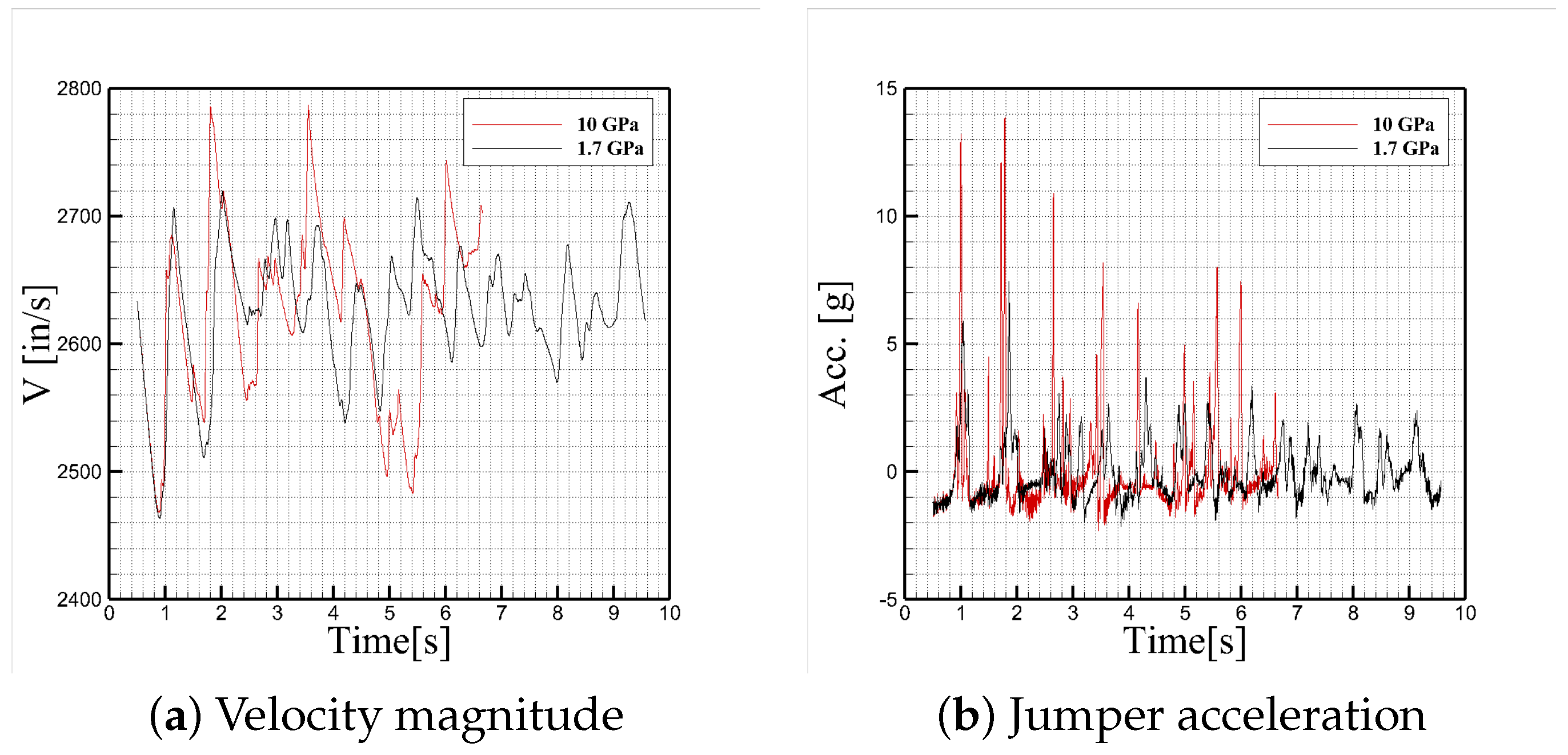 Figure 17 compares jumper acceleration for simulations using different values of Young’s modulus for the static line. The results show that a higher stiffness (e.g., 10 GPa) leads to more abrupt and larger acceleration spikes upon cable extension, indicating less damping and higher instantaneous load transfer to the jumper. In contrast, a lower stiffness (e.g., 1.7 GPa) produces smoother, less severe accelerations. These findings highlight the critical role of cable material properties in modulating the severity of towed-jumper dynamics. A stiffer cable may limit jumper motion but can increase the risk of injury due to sudden high-magnitude accelerations.