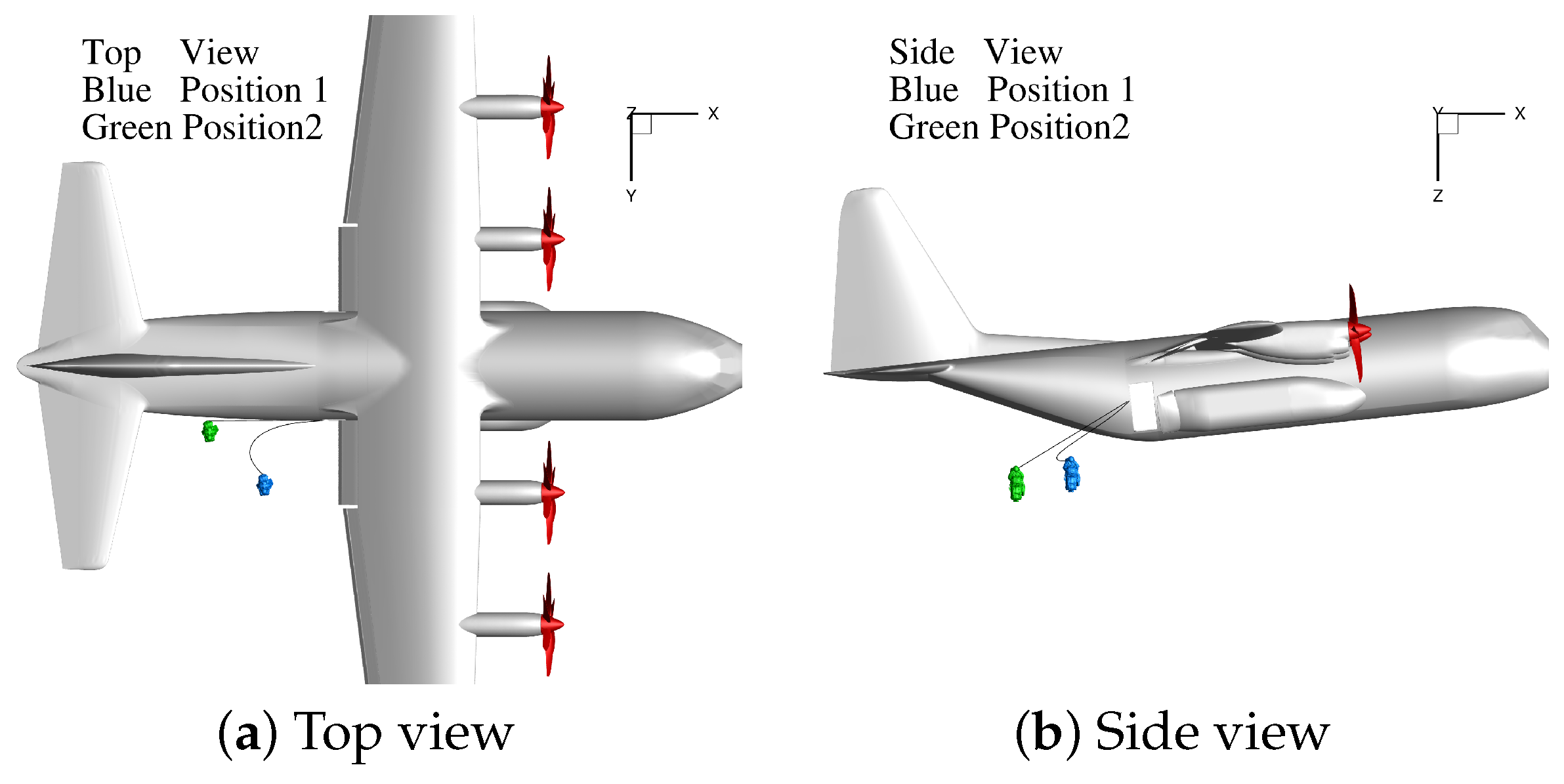 Additionally, we embedded troop door geometries into the A-400M meshes. Three configurations were created: one with the troop door on the right side, one on the left side, and one with both doors modeled. The A400-M grid has about 193 million cells.