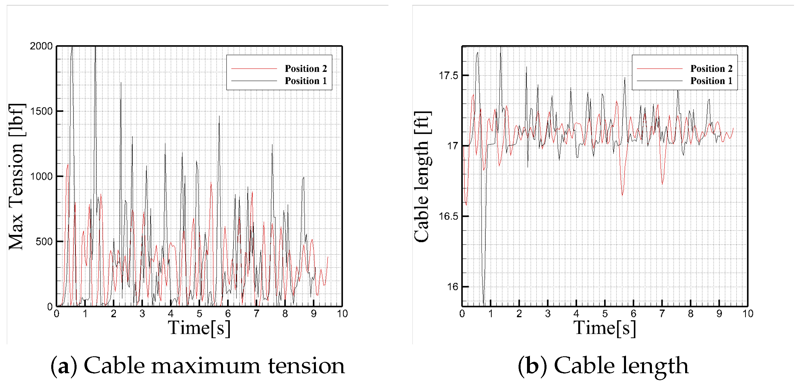 In the previous setup (Position 1), the initial jumper displacement was defined such that , creating a symmetric vector consistent with the 17-ft cable length. However, this configuration placed the jumper farther away laterally and vertically from the aircraft, introducing artificial motion early in the simulation as the jumper quickly adjusted to find a dynamically stable position.