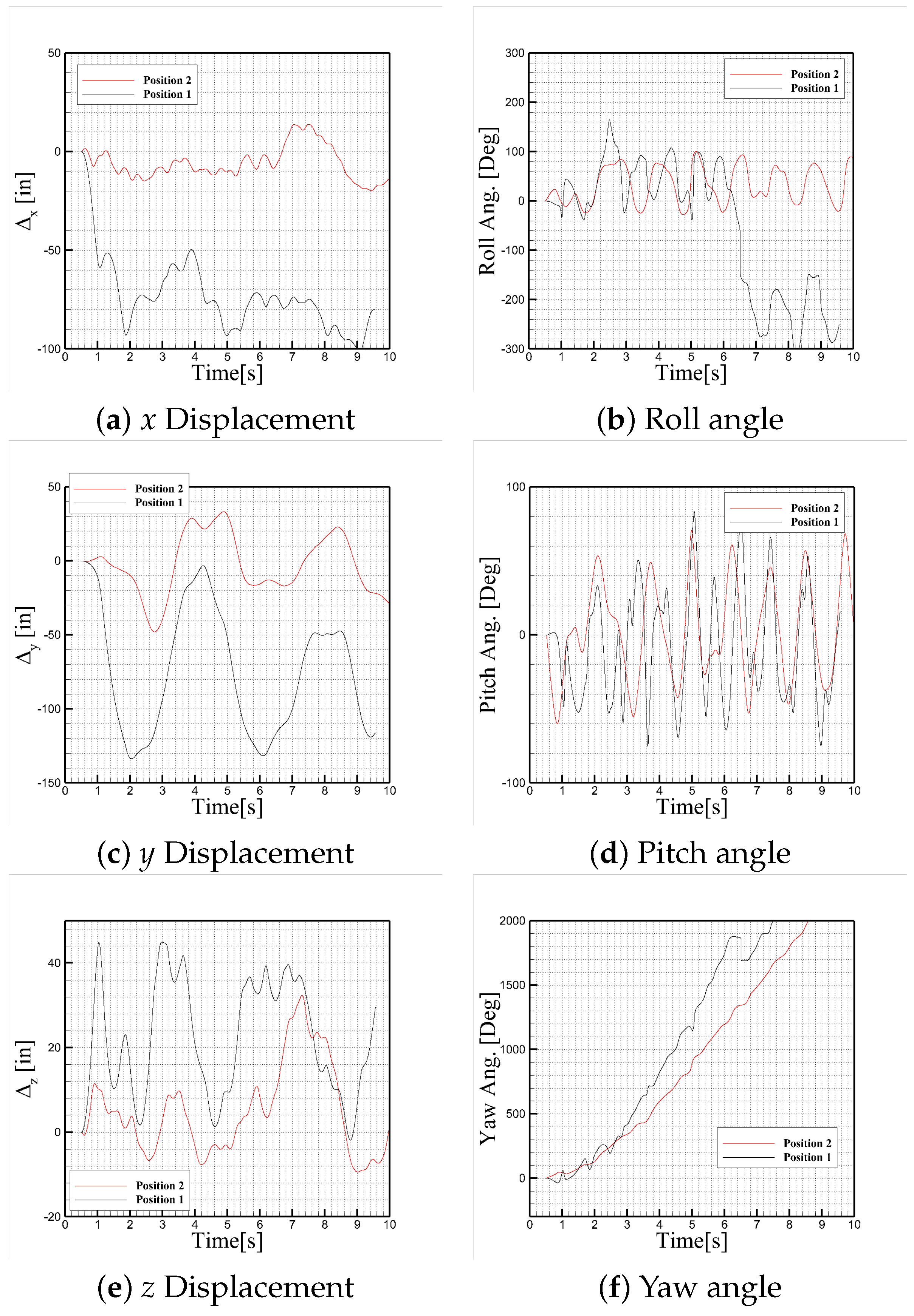 Across all three aircraft, the general trends in displacement and orientation are consistent, with similar amplitudes and directional response patterns. However, a key distinction is observed in the yaw angle history (