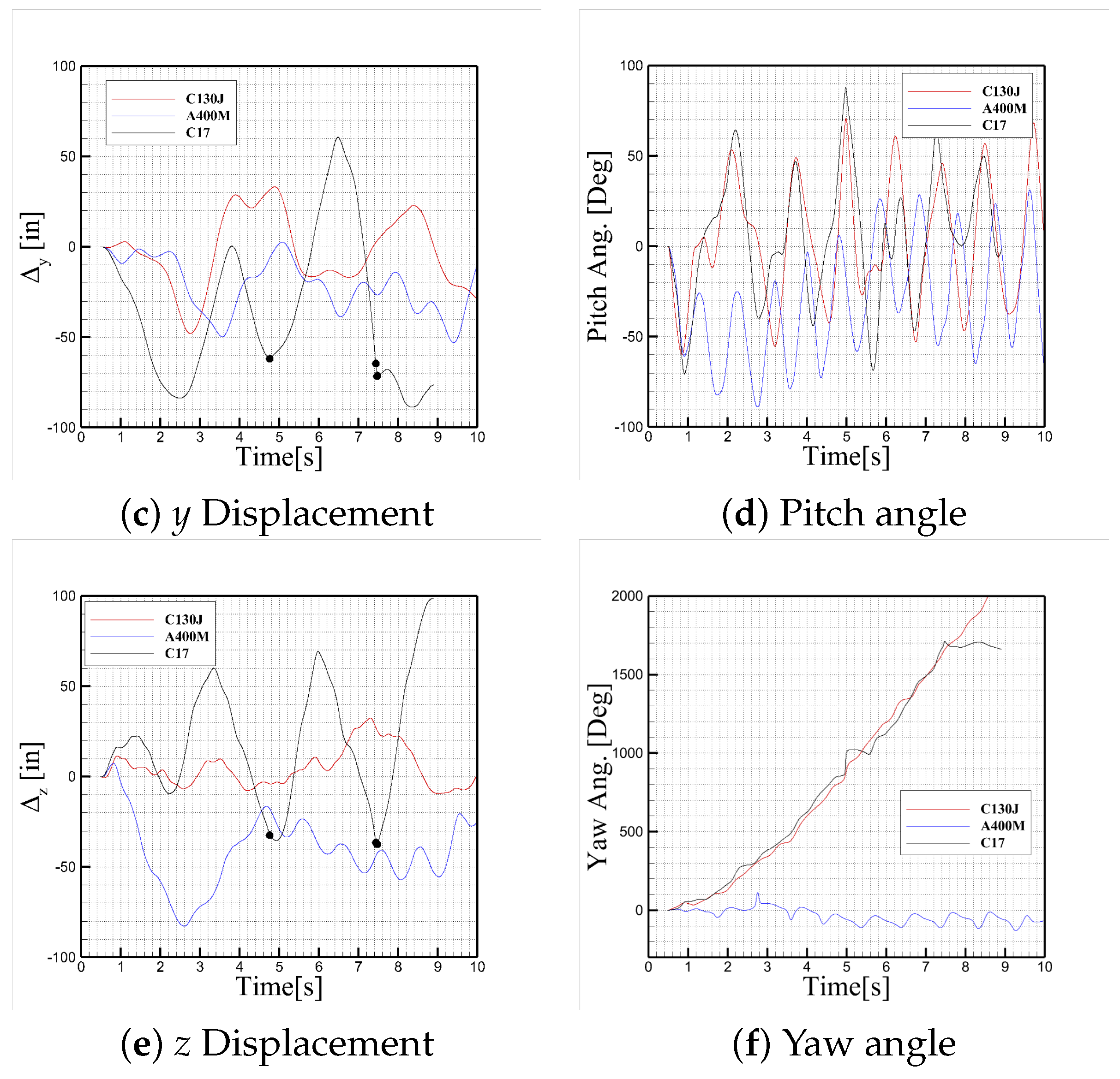 Figure 26f), where the A400M case exhibits significantly reduced yaw rotation compared to the C-130J and C-17 cases. This difference may stem from two primary factors. First, the C-130J and C-17 configurations used in this study include large flap deflections representative of operational airdrop conditions, which can generate strong trailing vortices and asymmetric flow structures near the troop door. In contrast, the A400M model in these simulations did not include flap deflection, resulting in a more symmetric and less rotationally biased flow field. Second, the A400M simulations used a simplified actuator disk model to represent propeller effects, which does not resolve blade-induced swirl and slipstream dynamics. This modeling simplification may have further reduced yaw-inducing aerodynamic moments on the jumper.