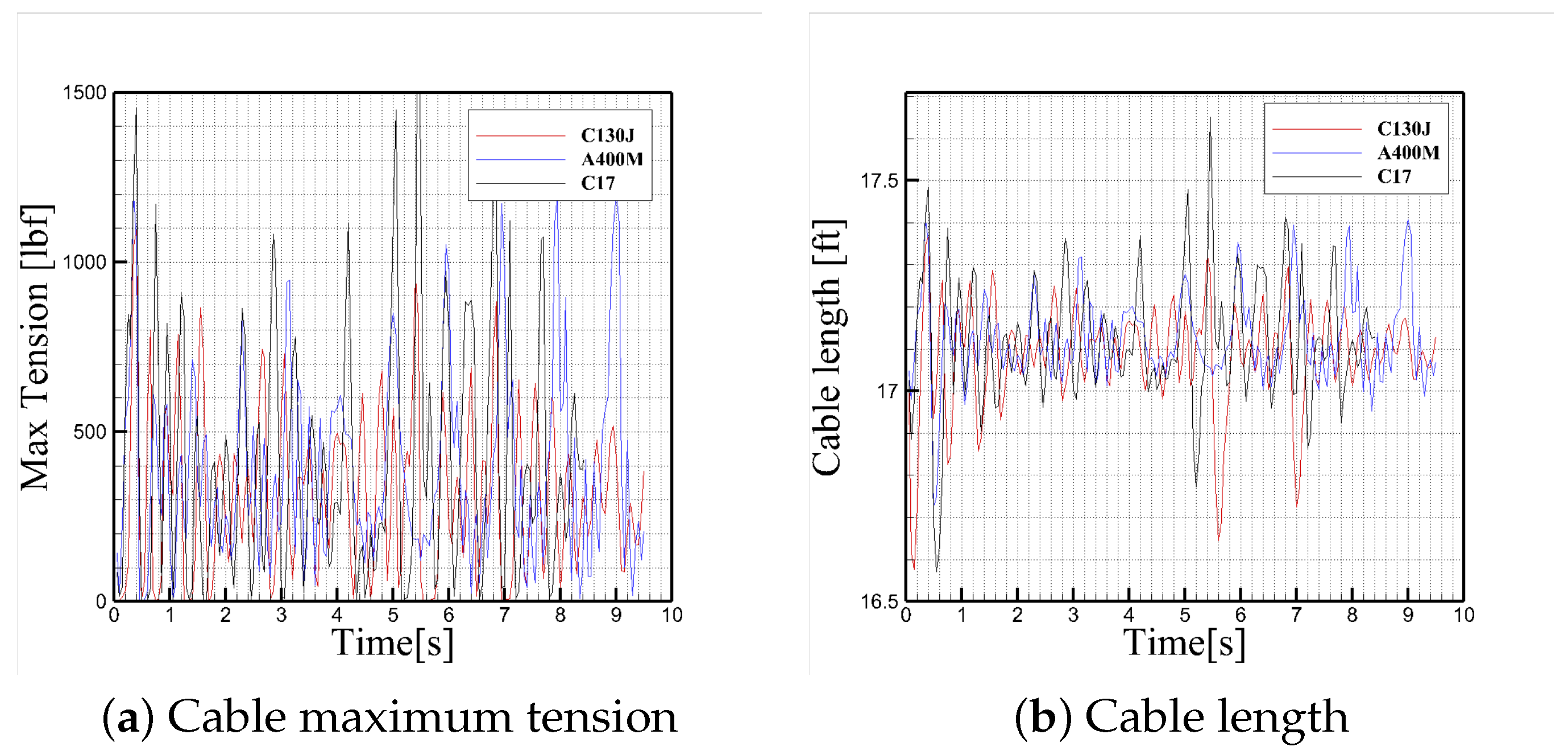 Figure 27 compares cable maximum tension and cable lengths for three different simulated aircraft. The cable attached to the towed jumper in proximity of C-17 shows higher tensions and more cable length variations compared with cables used in other aircraft.