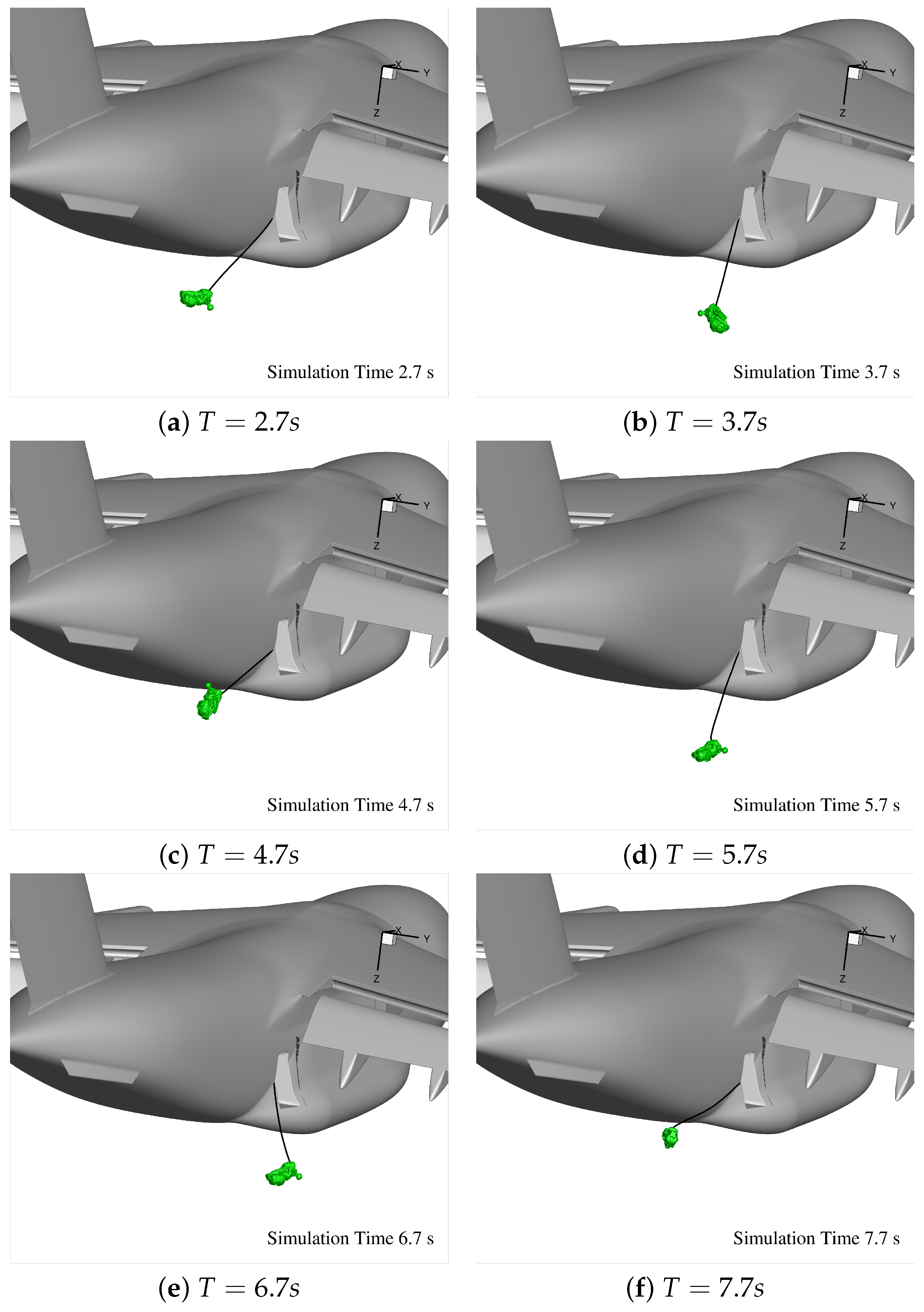 s. These frames illustrate the jumper’s evolving posture and spatial relationship with the aircraft as influenced by near-field aerodynamics, cable forces, and body dynamics. Notably, jumper-aircraft contact is clearly visible at