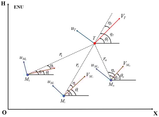 This paper considers a cooperative engagement scenario where  interceptors engage a high-speed maneuvering target from different azimuths. The vehicle-target relative kinematics are modeled in a two-dimensional plane. This 2D simplification is widely adopted in initial guidance law design [,] because it captures the fundamental engagement geometry (relative distance and LOS angle) while maintaining analytical tractability. It serves as a critical first step towards future extension to three-dimensional scenarios. The engagement geometry is shown in Figure 1.