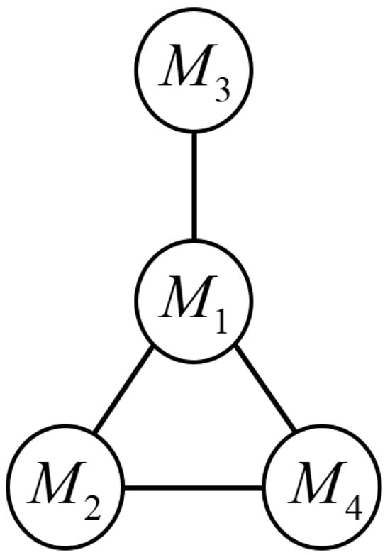 The effectiveness of the preset performance control cooperative guidance (PPCCG) guidance law designed in this paper was verified through simulations, particularly focusing on addressing the chattering and oscillation issues in guidance commands during cooperative engagement with high-speed maneuvering platforms. Simulations were conducted in which the target performs both S-maneuvers and circular maneuvers, with the results compared against the cooperative guidance law proposed in []. The S-maneuver represents a high-frequency, abrupt evasion tactic, while the circular maneuver tests the system’s response to a sustained, high-g turn [,]. These scenarios are challenging and standard for evaluating guidance performance against maneuvering platforms. The simulation scenario involved four cooperative Vehicles engaging a high-speed maneuvering target, with acceleration limits set at 10g along the LOS direction and 40g in the normal direction (where g = 9.81 m/s2). The simulation step size was configured as 1ms, and the simulation terminated when all vehicle-target relative distances simultaneously became less than 1m. The communication topology among the interceptors is shown in Figure 2.