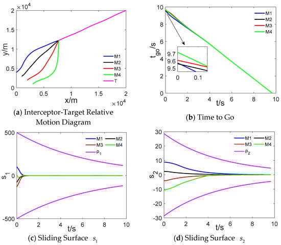 Parameter Sensitivity Discussion: Although no large-scale parameter perturbation Monte Carlo simulations were conducted, we observed during parameter selection that the proposed guidance law exhibits good robustness within the neighborhoods of the parameters listed in Table 2. System performance metrics (such as miss distance and engagement time) are insensitive to small variations in these parameters. For instance, when  and sliding surface parameters  and  varied within ±30%, the guidance law still successfully completed the cooperative guidance tasks. Miss distance fluctuations remained within ±0.2 m, line-of-sight angle errors varied within ±0.35 degrees, and command curves remained smooth. This indicates that the method’s performance does not depend on an extremely stringent set of parameters. Future research will focus on in-depth parameter sensitivity analysis and optimization.