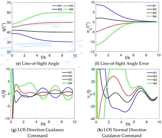 Table 3 demonstrates that all four interceptors achieved miss distances within 0.12 m, LOS angle errors below 0.17°, and identical engagement times of 9.672 s, indicating excellent guidance performance. A rigorous quantitative performance evaluation of the designed non-homogeneous disturbance observer was conducted. Simulation results shown in Figure 3 demonstrate that the observer’s efficacy in estimating the time-varying target maneuver . The observer in the LOS normal (angle) channel exhibited superior rapidity with a convergence time of 0.5 s; the convergence time for the LOS direction (range) channel was 2.0 s. After convergence, the steady-state maximum absolute error was below 0.5 m/s2 with a steady-state RMSE below 0.3 m/s2 for the range channel. For the normal channel, the steady-state maximum absolute error was below 0.15 m/s2 with a steady-state RMSE below 0.1 m/s2. Compared to the target’s maximum maneuver acceleration of 98.1 m/s2, the steady-state estimation achieved relative accuracies of 99.49% and 99.85% for the range and normal channels, respectively. Figure 4a,b confirm that the PPCCG law successfully achieved time- and angle-cooperative engagement, enabling simultaneous target engagement with terminal LOS angle constraints. Figure 4c,d reveal that both the LOS axial and normal sliding surfaces converged asymptotically near steady-state values and eventually approached zero under prescribed performance bounds, realizing zero-error synchronized engagement of the maneuvering target. Figure 4e,f illustrate that the LOS angles converged to their desired values with terminal LOS angular rates approaching zero, satisfying spatial angle constraints. The saturation observed in the normal acceleration command (Figure 4f) is due to initial large errors and will be addressed in future work through parameter optimization and performance function refinement. The guidance command curves in Figure 4g,h show transient saturation during the initial phase due to varying interceptor positions and relatively large estimation errors in the observer. As the observer’s estimates converged to the target’s true acceleration, the saturation diminished. The persistent saturation observed in the normal acceleration command (Figure 4h) is attributed to the significant initial LOS angle error, which necessitates the use of maximum available control effort for rapid convergence to meet the terminal angle constraint. This initial demand can lead to transient command variations.