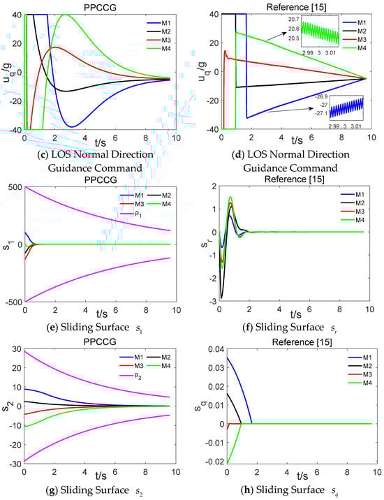 Table 4 and Table 5 present the terminal performance metrics for both methods. It is evident that both the PPCCG law and FTCG law achieve cooperative engagement, with off-target quantities below 0.03 metres and terminal angular errors below 0.18°. Their time-of-arrival consistency indicates comparable terminal steady-state accuracy. However, significant differences exist in their dynamic performance, particularly concerning guidance command quality. Figure 5a–h present a side-by-side comparison of the simulation results for both methods. As illustrated in Figure 5b,d, the guidance commands generated by the FTCG law (right panel) exhibit severe high-frequency chattering throughout the entire trajectory, representing an inherent drawback common to conventional sliding-mode control. Such chattering necessitates frequent actuator system operations, leading to accelerated equipment wear, increased energy consumption, and the potential excitation of unmodelled dynamics in practical engineering applications, thereby compromising vehicle stability. In contrast, the PPCCG law proposed herein (left panel) generates exceptionally smooth and continuous commands, entirely eliminating such chattering. This stems from the precise constraints imposed by the preset performance control on the system’s state convergence process, fundamentally smoothing the control signal. Comparing the sliding surface convergence curves in Figure 5e–h, it is evident that the sliding surface of the FTCG law exhibits overshoot and exhibits abrupt changes during convergence, lacking smoothness. In contrast, the sliding surface of the PPCCG law (left figure) converges asymptotically to zero without overshoot or oscillations under the constraints of the preset performance function, demonstrating superior transient performance.