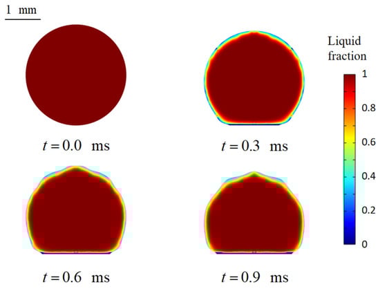 Although the combined VOF-solidification-Darcy momentum source framework is well established, one critical issue in the simulation of supercooled droplet impact has been largely overlooked: erroneous activation of the Darcy momentum source. When ambient temperatures are set below the freezing point, simulations often falsely identify freezing regions at the droplet–air interface during the initial impact stage. As a result, the Darcy source suppresses local velocities at the contact line prematurely. In contrast, experimental observations consistently indicate that freezing begins at the droplet–substrate contact line and then gradually propagates from the bottom into the droplet until reaching the upper surface [,,]. This means that freezing should not occur at the droplet–air interface during the early impact stage. In numerical simulations, the error introduced by this false activation is small when the impact velocity is low, as the effect of Darcy momentum source is limited. However, at higher impact velocities, the suppression becomes significant in these misidentified regions, distorting the spreading morphology and undermining the physical credibility of the simulations. This effect is illustrated in Figure 1, which shows spurious freezing at the droplet–air interface leading to distorted droplet shapes during the early spreading stage.
