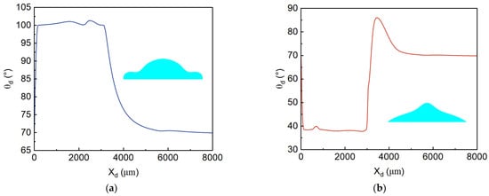 remains constant. However, in reality, surface roughness causes the contact angle to vary with the velocity of the contact line, resulting in a dynamic change, which is referred to as the dynamic contact angle (DCA) []. Several empirical models for the dynamic contact angle have been proposed, among which the empirical model developed by Kistler [] has shown good agreement with experimental data [] and has therefore been widely adopted. In this model, the dynamic contact angle