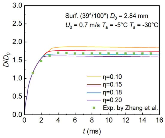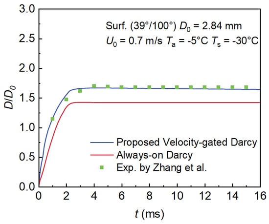 As discussed in Section 2.3, the Darcy momentum source is commonly employed to mimic the progressive reduction in velocity as a droplet solidifies. However, in supercooled droplet impact simulations, when the ambient temperature is set below the freezing point, the model tends to misidentify the droplet–air interface as a frozen region at the very beginning of spreading. This premature activation leads to unrealistic velocity suppression, especially at high Reynolds numbers, where the distortion of droplet morphology becomes pronounced (as illustrated earlier in Figure 1).