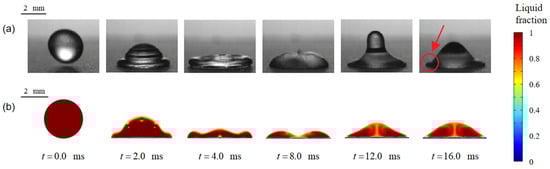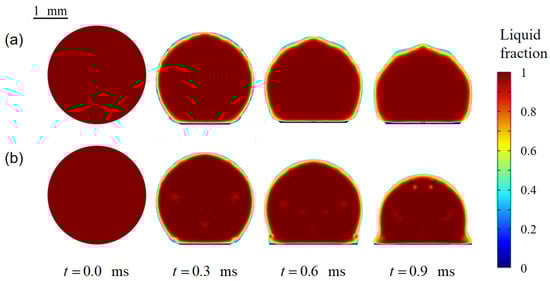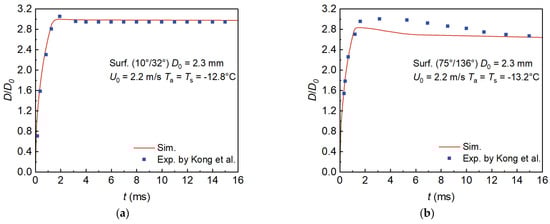 ). This ensures that the droplet is entirely liquid with no pre-existing solidified region. This treatment is consistent with the physical assumption that nucleation and recalescence occur instantaneously upon impact, so the droplet has reheated to the freezing point at the start of the simulation. To reduce computational cost and, more importantly, to be consistent with the assumption that the droplet temperature returns to the freezing point upon first contact, the droplet is initialized with its bottom tip touching the substrate and assigned an initial velocity. This strategy has also been widely employed in previous studies [,,,,]. The initial droplet diameter is set to