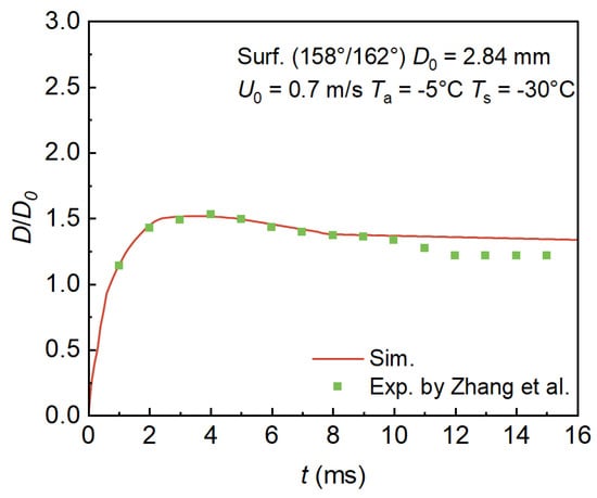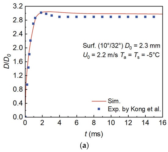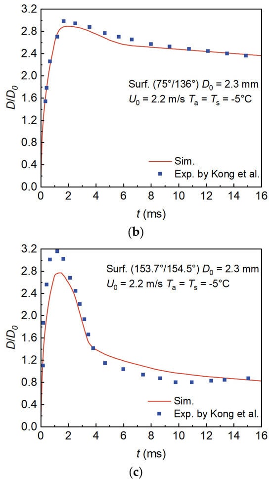 - Chang, S.; Liang, D.; Song, M.; Leng, M. Numerical investigation on impingement dynamics and freezing performance of micrometer-sized water droplet on dry flat surface in supercooled environment. Int. J. Multiph. Flow 2019, 118, 150–164. [Google Scholar] [CrossRef]