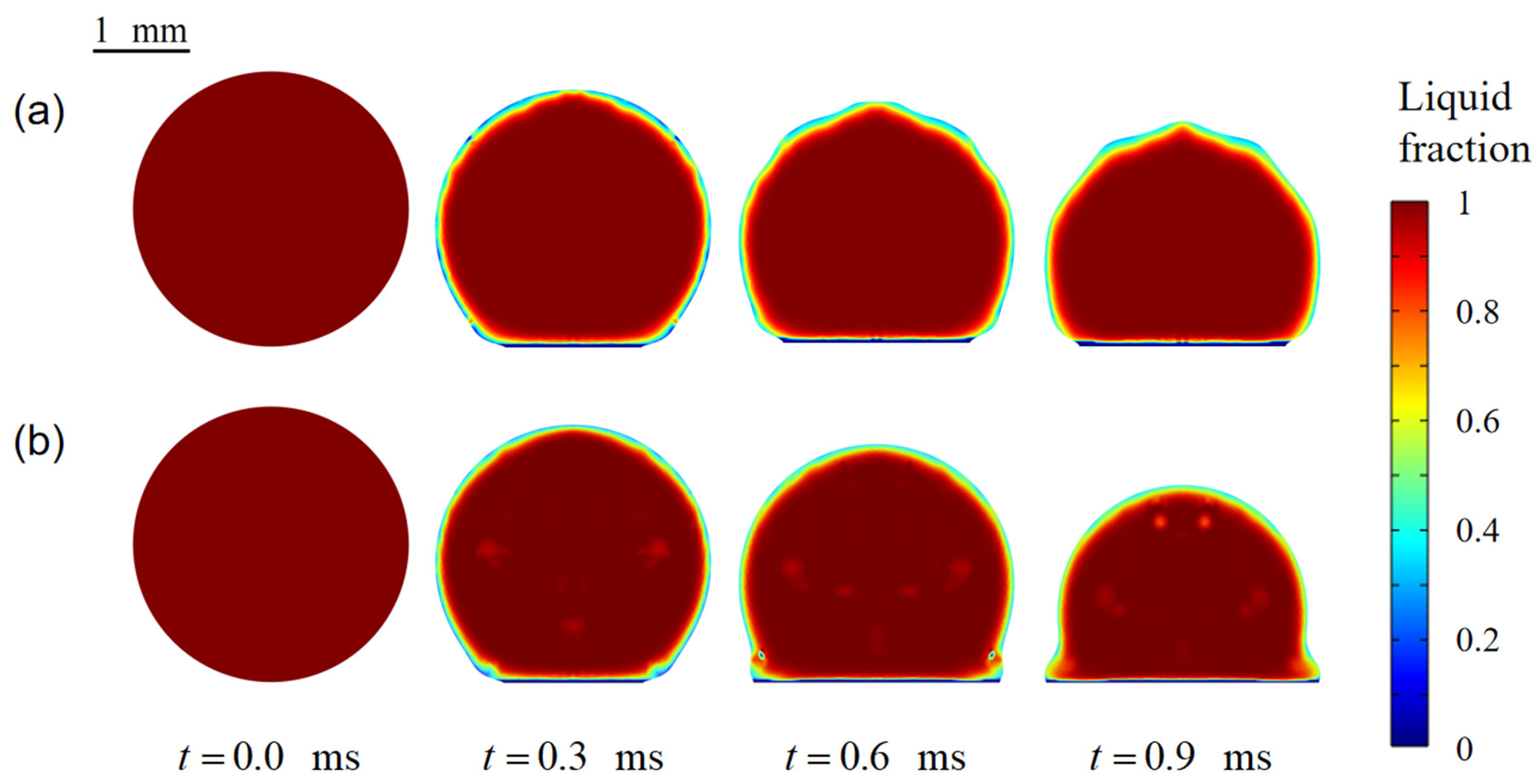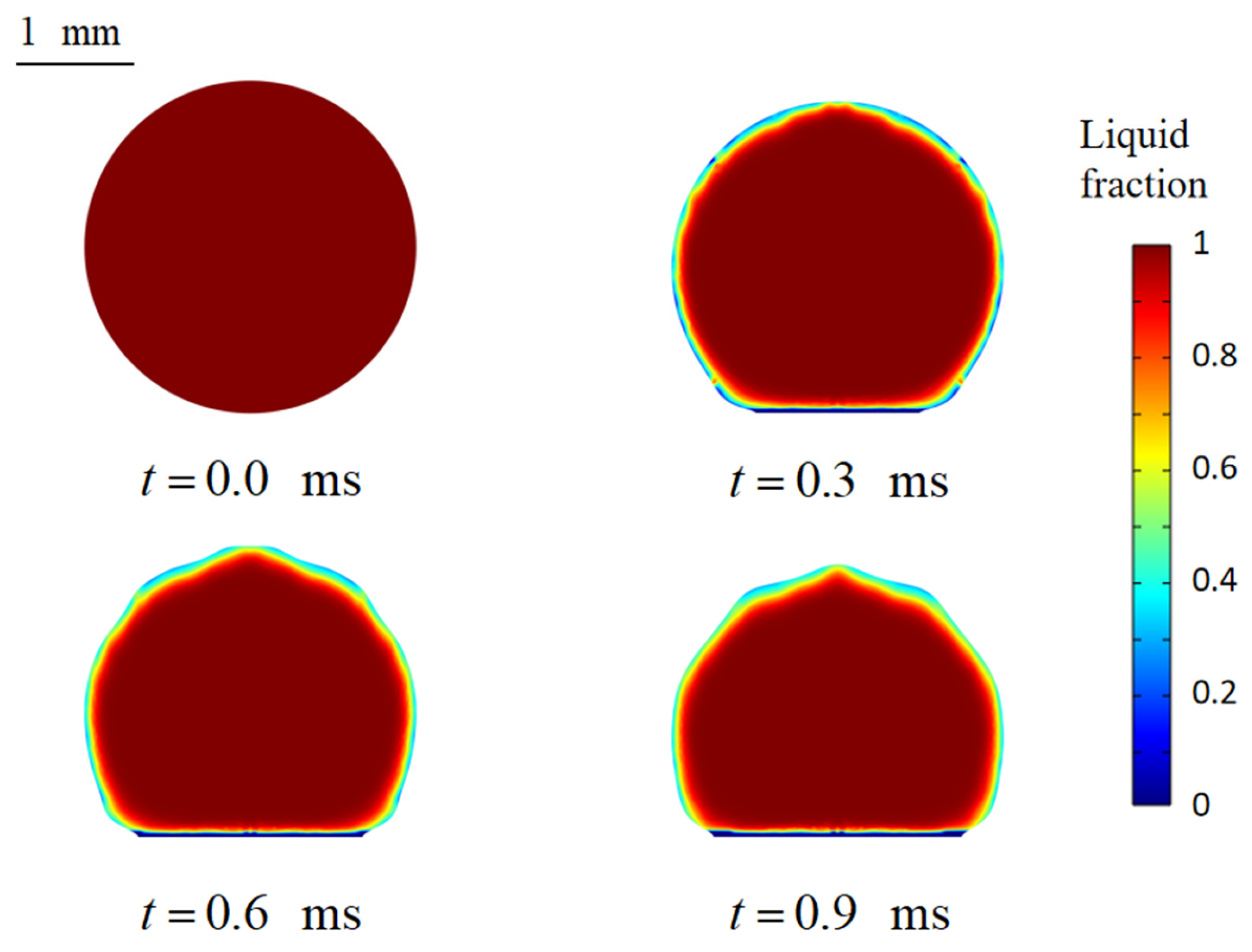 Figure 9, the simulation captures the droplet dynamics well during the spreading and early recoiling stages. However, at later times, freezing at the droplet–substrate contact line causes the spreading factor to be fixed, preventing the reproduction of the secondary recoiling observed in the experiment. This leads to slightly higher simulated values in the later stage. Nevertheless, the simulation successfully captures the physical phenomenon where contact line freezing results in an almost constant spreading factor. Therefore, the proposed method remains effective in reproducing the supercooled droplet impact behavior on superhydrophobic substrates.