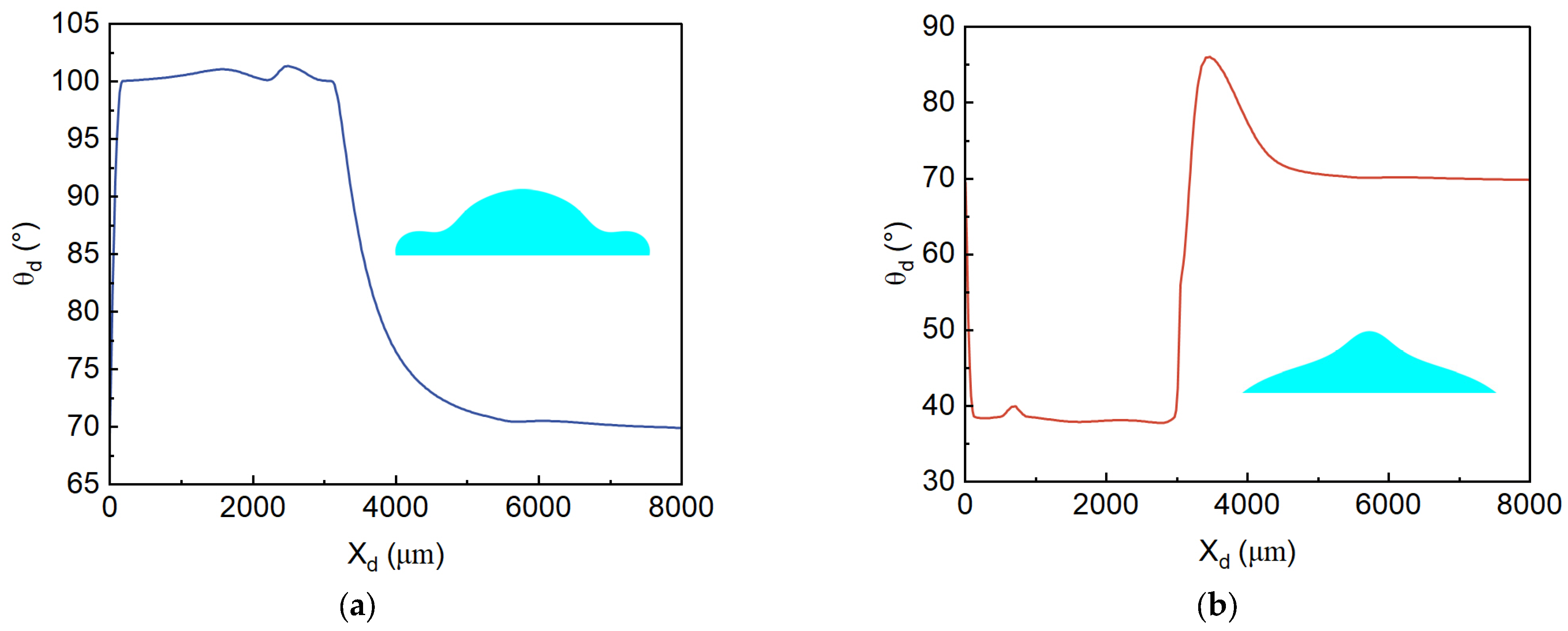 Figure 4a, the droplet is in the spreading stage, and the dynamic contact angle