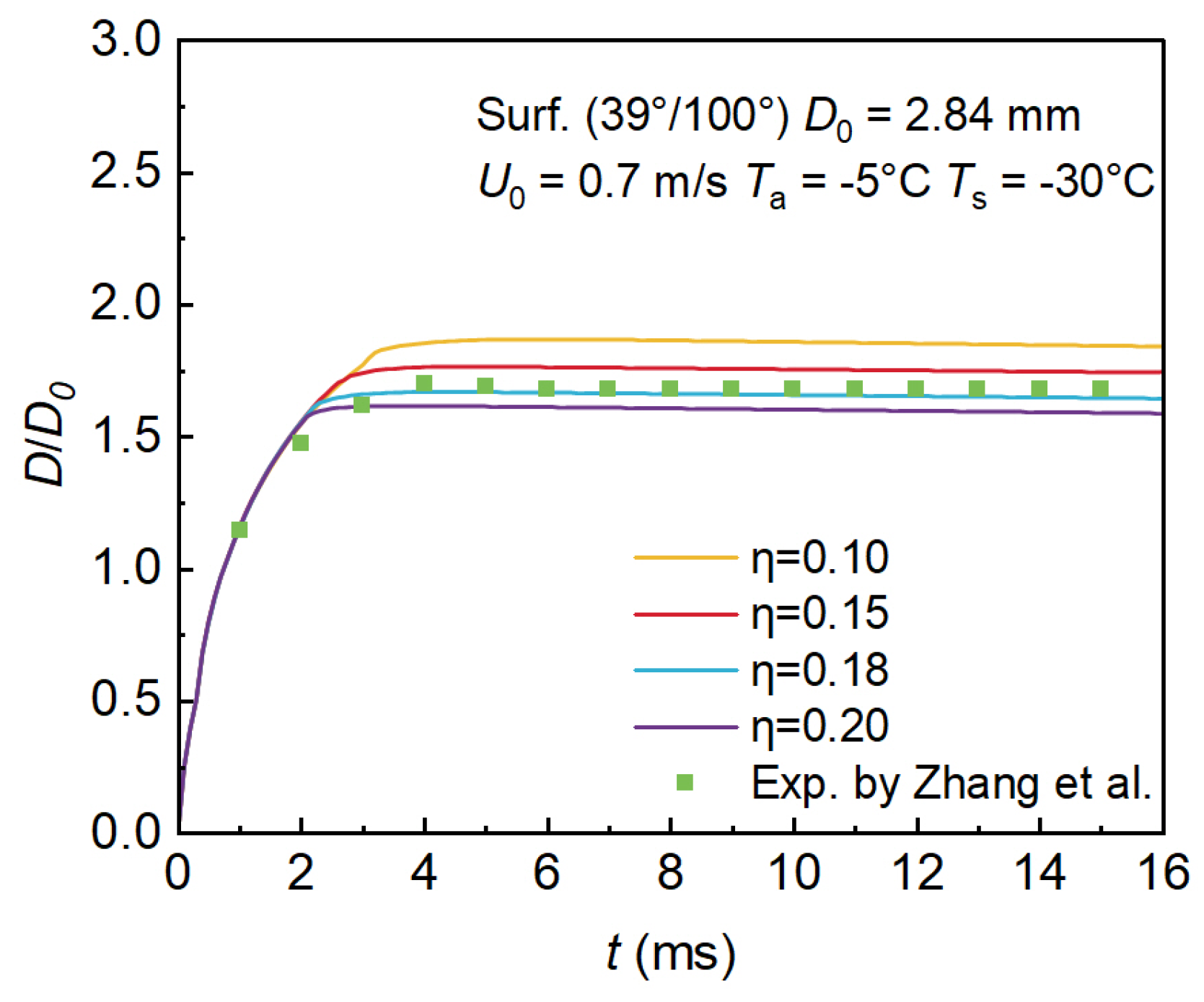 We further simulate the experiments conducted under different temperature conditions, and the maximum spreading factors obtained from both simulations and experiments are summarized in