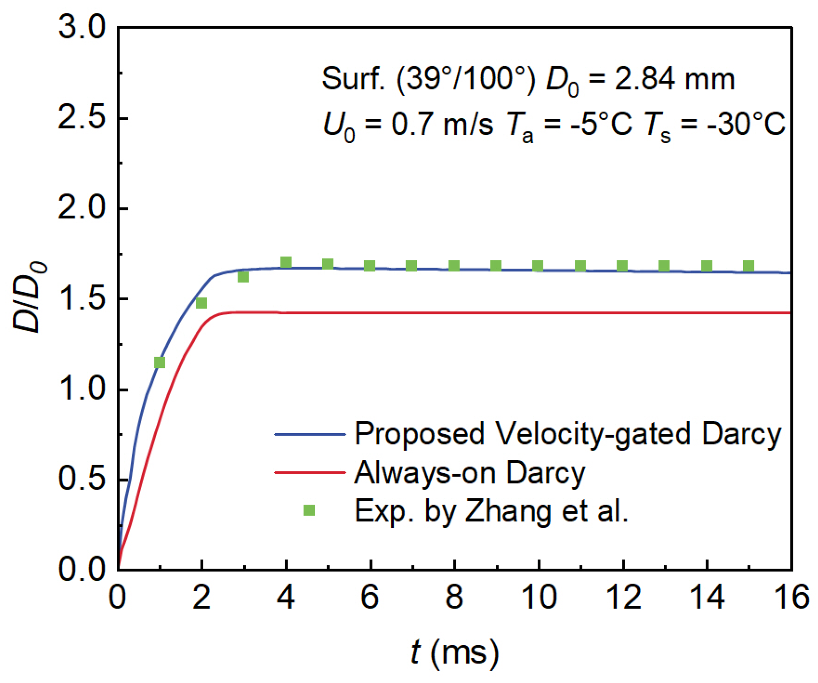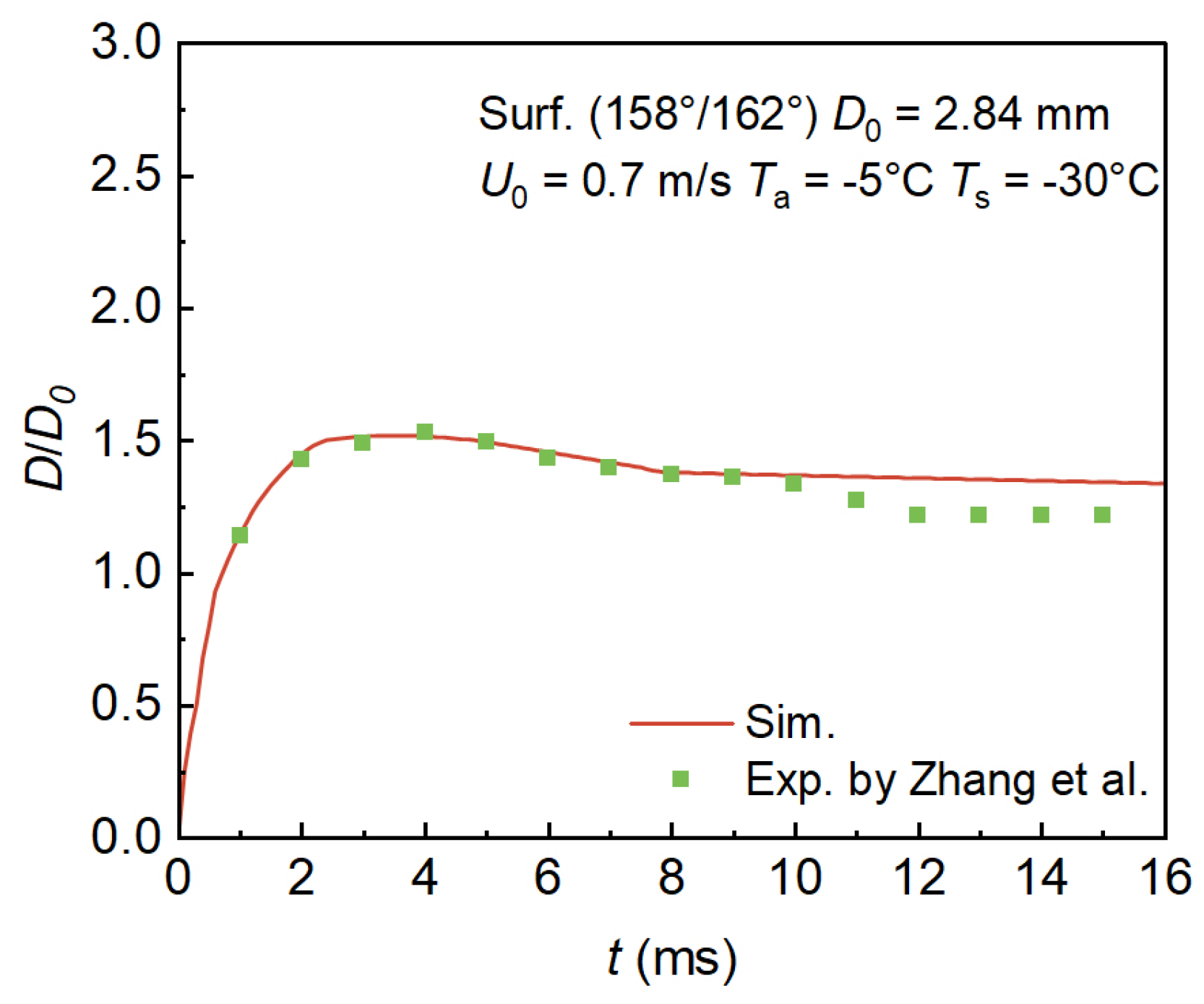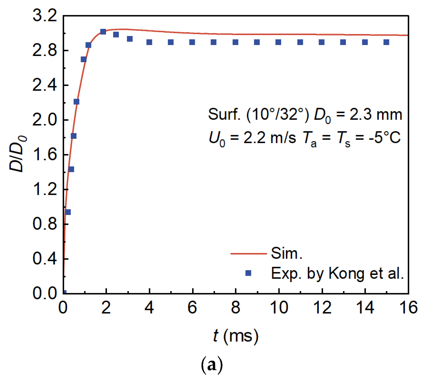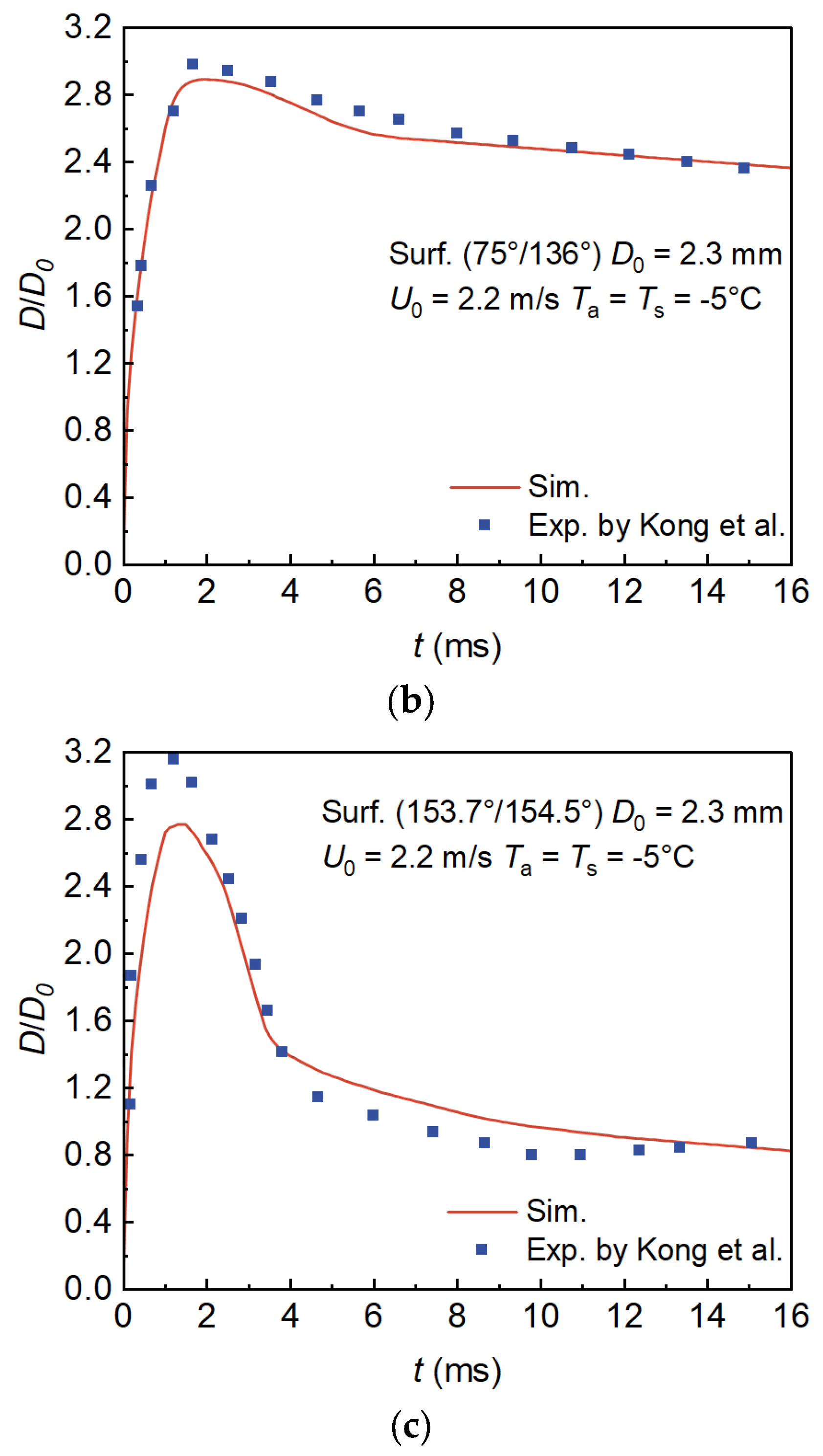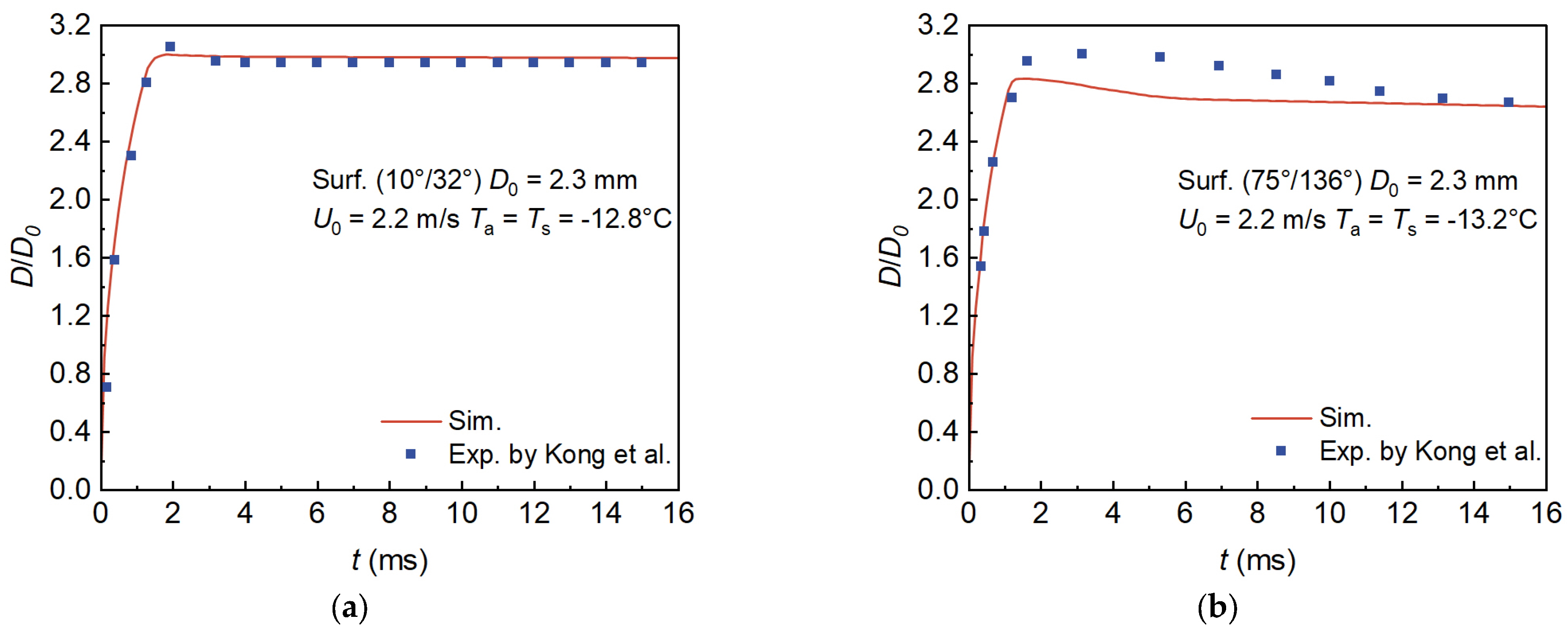 Figure 10c. Although the predicted maximum spreading factor exhibits a relative deviation of −11.7%, the simulation still captures the overall spreading-recoiling dynamics well. In particular, the predicted spreading factor during the recoiling stage closely matches the experimental data, suggesting that the model remains capable of providing meaningful predictions under this condition. The relatively larger deviation mainly arises from two aspects: first, the limitation of the dynamic contact angle correlation when extrapolated to extremely high apparent angles, which cannot fully represent the actual wetting behavior on textured superhydrophobic surfaces; and second, the Darcy damping formulation suppresses the velocity of frozen regions completely, while in reality partially frozen layers on superhydrophobic substrates may still undergo slip-like motion together with the droplet. This over-constraint of the spreading stage leads to an underprediction of the maximum spreading factor, although the subsequent recoil is reproduced satisfactorily.
