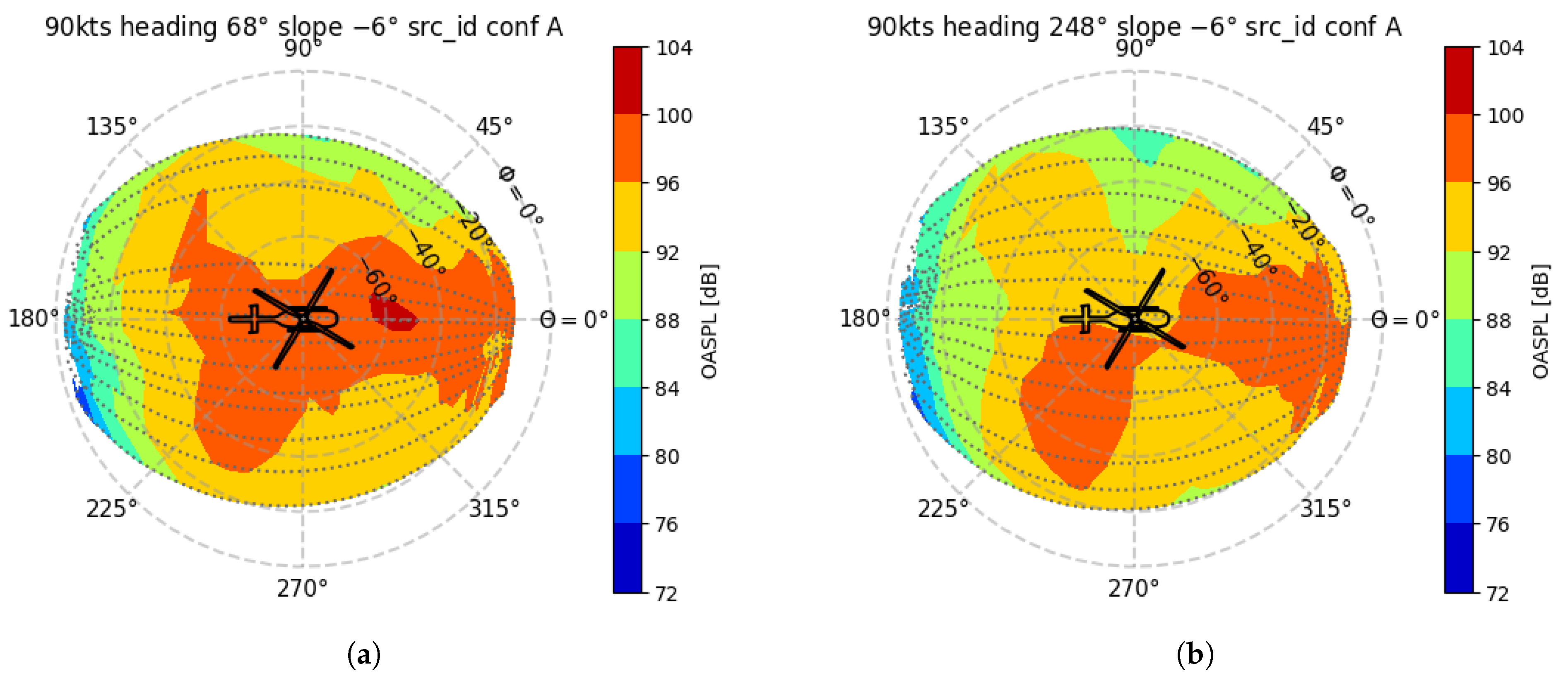 ). It must, however, be kept in mind that the measured hemispheres are for steady flight, whereas the departure is a maneuver (accelerated and turning). It is also possible that the wake development in a left turn is different from that in a right turn, which could lead to more noise generation and/or different directivity. Further investigation is necessary to fully explain the exact cause of the difference between left and right curve departure.