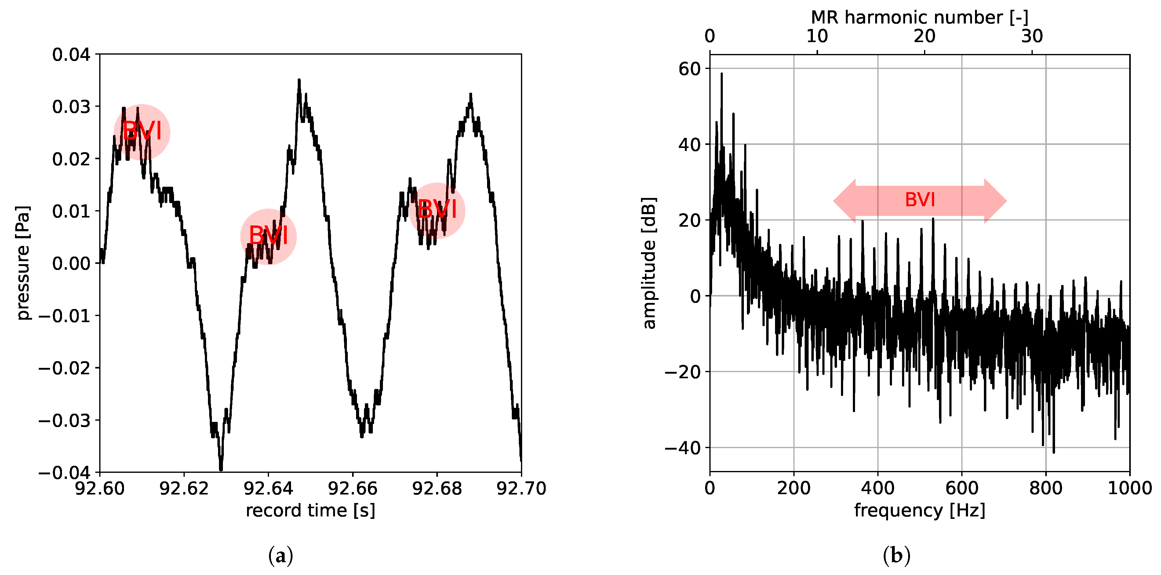 Figure 8a,b give an example for an approach where BVI occurs. On the left, the acoustic pressure in the time domain is shown at the moment when the helicopter is still more than 2 km away from microphone M33. The signal is dominated by the first main rotor BPF. However, small oscillations (annotated in red) can be seen, which are caused by BVI. Even though these oscillations are very small, they can be heard in the recording. On the right is a spectrum of a (larger) time section around 92 s before landing. The lower horizontal axis shows the frequency in Hz, while the upper horizontal axis shows the main rotor harmonic BPF number. The higher harmonics caused by BVI can be clearly seen (marked by the red arrow). Even though they are two orders of magnitude smaller than the first main rotor harmonic, they can be heard because they occur in a frequency band to which the human ear is much more sensitive compared to the first few main rotor BPF harmonics. So when BVI occurs, the first BPF is no longer a good estimate of the spectrum. In order to detect BVI, a filtering in the range of 15–25 main rotor BPF harmonics is useful. When high-quality data is available, Doppler frequency shift and rotor RPM variations can be compensated to obtain a clean acoustic signal where the rotor harmonics are located at well-defined frequencies. However, due to time synchronization issues with the FDR data and the relative inaccurate position, disturbances will cause the frequencies to shift to unknown locations. For this reason, a more wide band filtering based on the wavelet transform in the frequency range 300–700 Hz is used here [