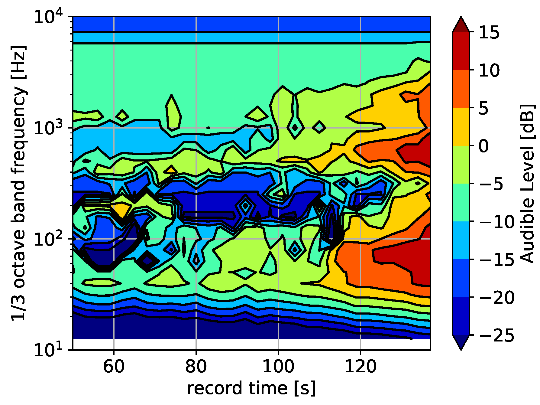 km). Based on the tone around 30 Hz, this could very well be a 5-blade Airbus helicopter that was seen in the area during the measurements. It was not possible to do extensive post processing in real time during the measurements, in order to ensure that no interference occurred during the measurements. Therefore, the detection of this disturbance was carried out during post processing after the flight tests. This example indicates that for this type of measurement, very strict limitations on allowable air traffic in a wide range (multiple kilometers) must be ensured, especially for aircraft generating similar noise. At a recording time of 140 s, the audible level displays a minimum around 300 Hz. This can be understood based on the shape of the spectrum. At low frequencies, the spectrum is dominated by lower harmonics, which drop off with increasing order. Harmonics due to unsteady loading typically manifest themselves at higher frequencies; see also